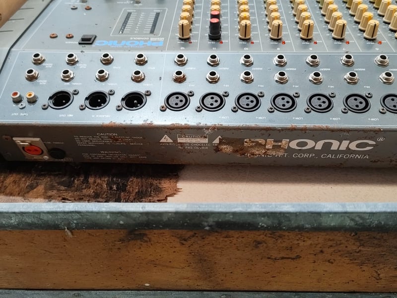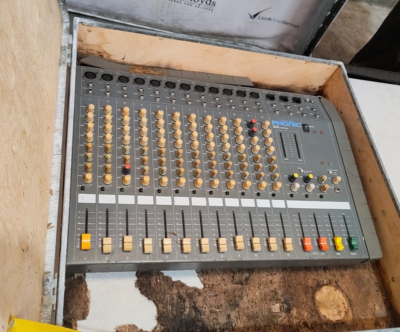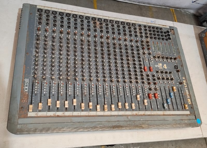 Assorted items including:Soundcraft 24 Channel Spirit Live 4Phonic PMC1202B 12-Channel Mixing ConsoleNote: working condition unknown, no power cables with items, items in used condition, console box heavily damagedSold as lot