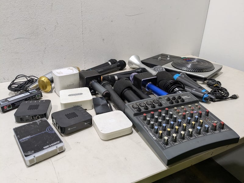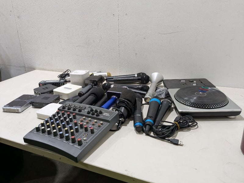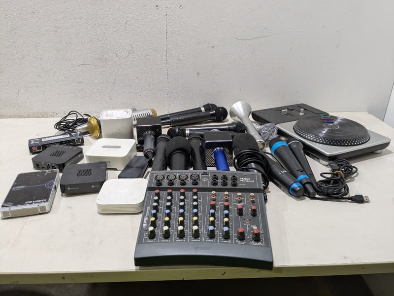 Assorted electronic audio items include Soundcraft electronics, DJ Hero wireless turntable and more...