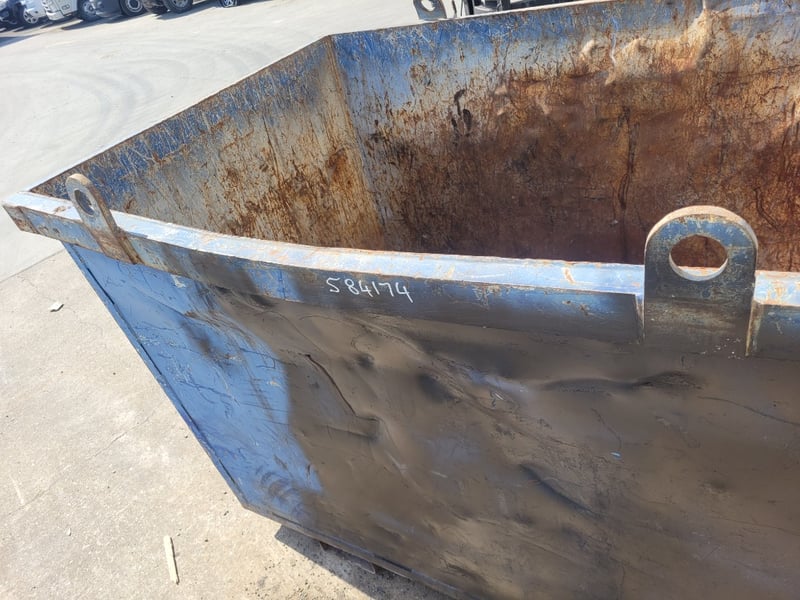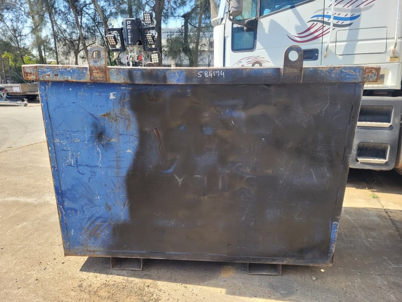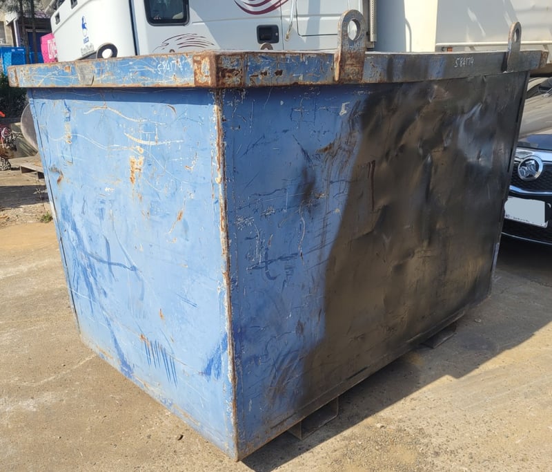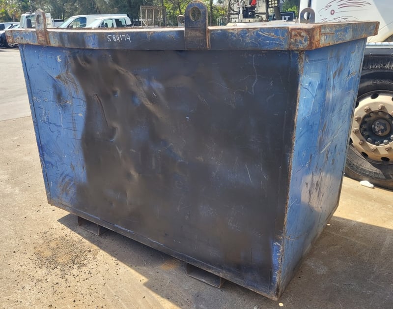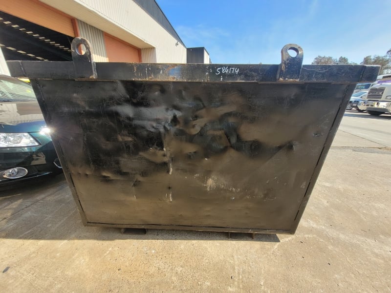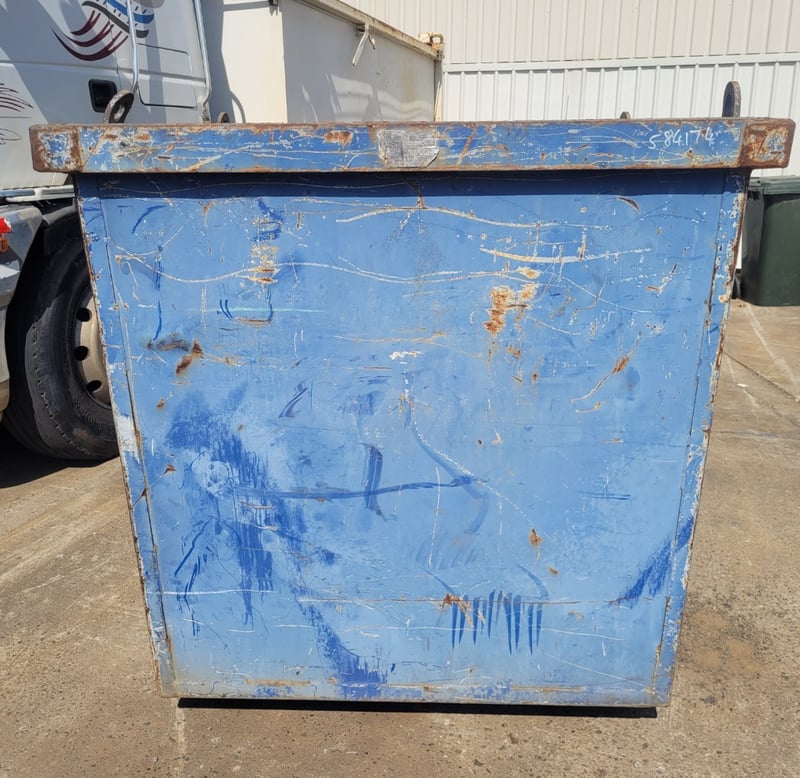 Description: Steel skip bin, approximate overall dimensions L1.9m x W1.3 x H1.3/1.4m to top of lifting lug, forklift sleeves, x4 top of bin lifting lugs.