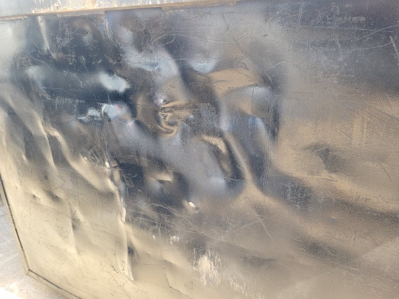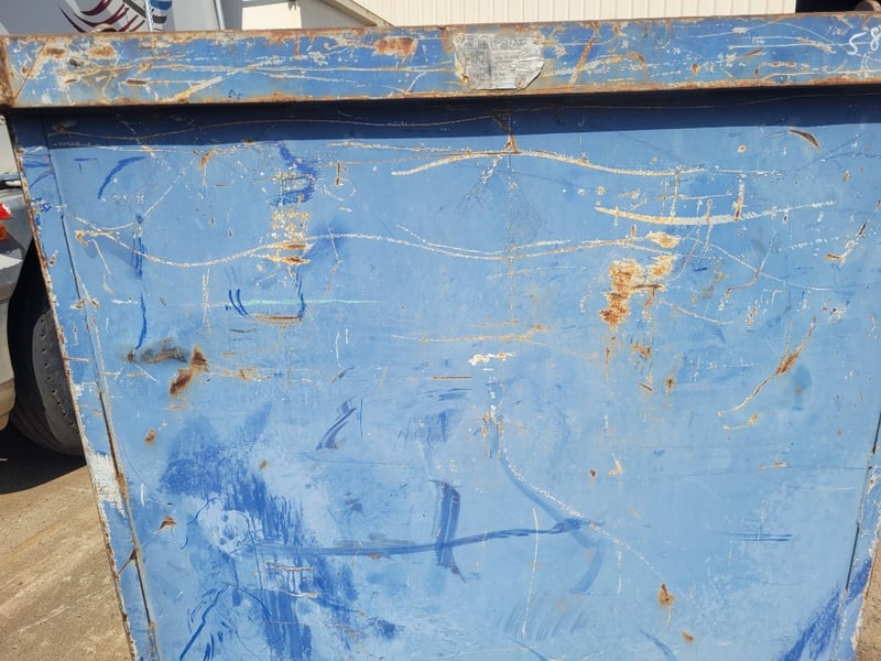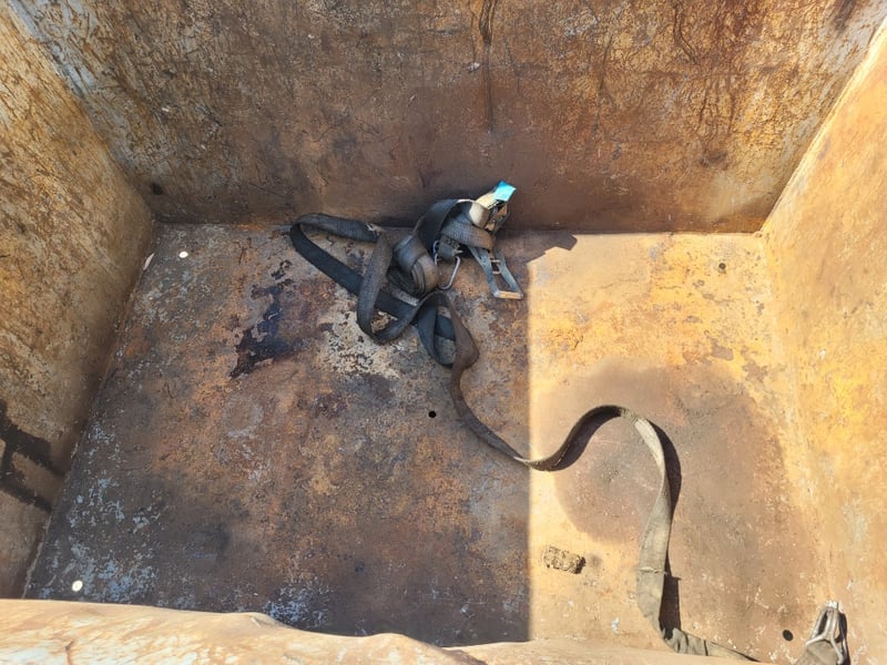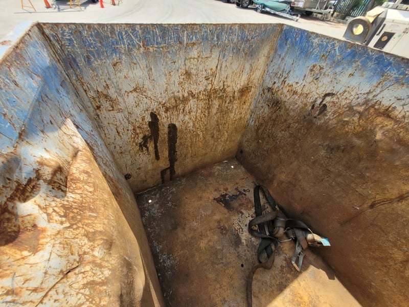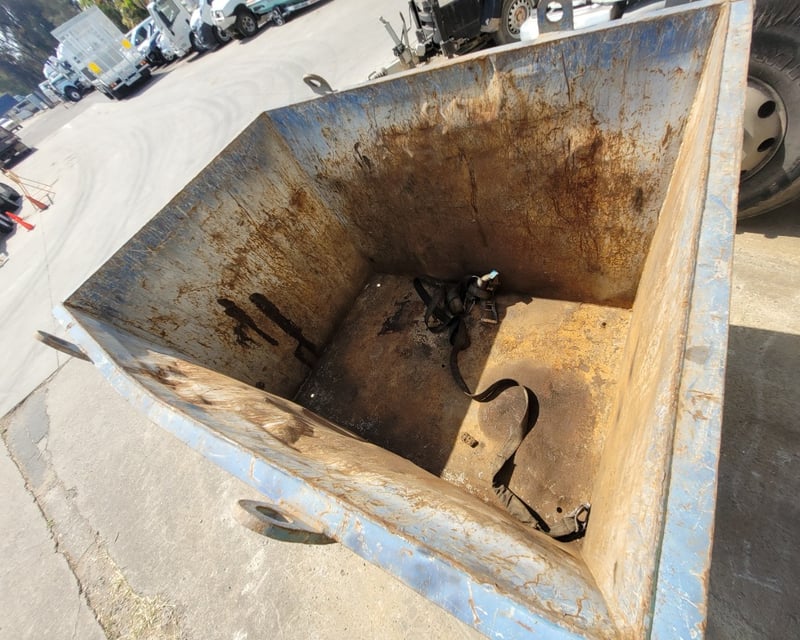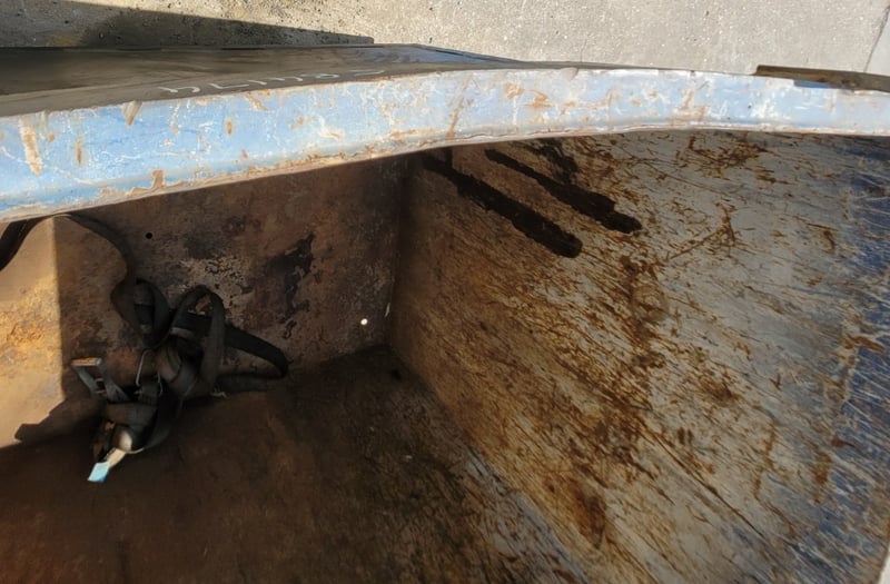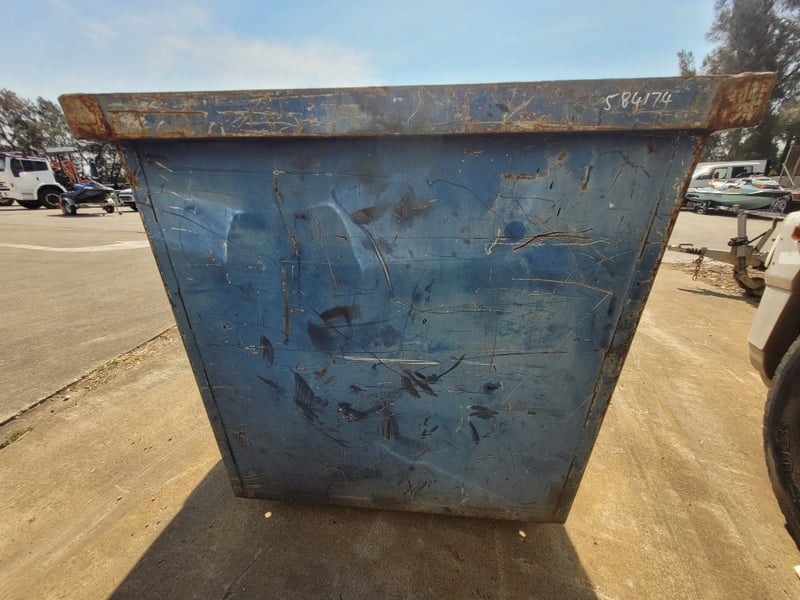 Description: Steel skip bin, approximate overall dimensions L1.9m x W1.3 x H1.3/1.4m to top of lifting lug, forklift sleeves, x4 top of bin lifting lugs.