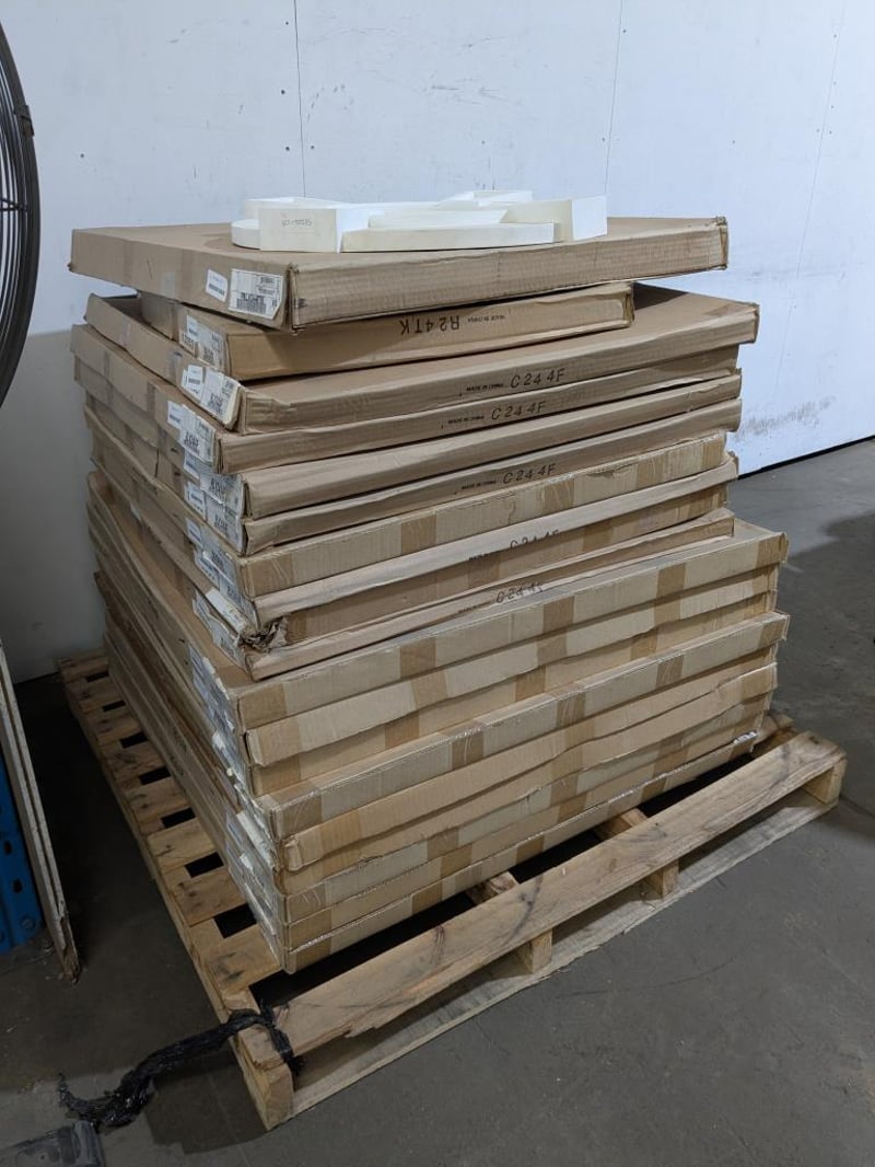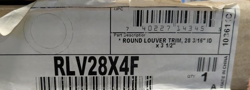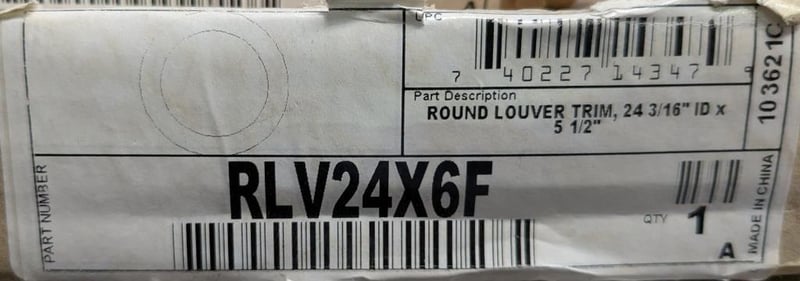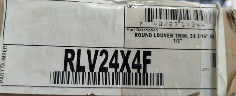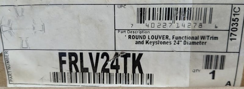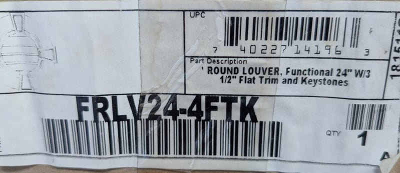 Assorted items include: - FRLV24-4FTK Round Louver, Functional 24" W/3 1/2" Flat Trim and Keystones - FRLV24TK Round Louver, Functional W/Trim and Keystones 24" Diameter - RLV24X4F Round Louver Trim, 24 3/16" ID 1/2" - RLV24X6F Round Louver Trim, 24 3/16" ID X 5 1/2" - RLV28X4F Round Louver Trim, 28 3/16" ID X 3 1/2" Qty: 20 items per lot. Bid per pallet.