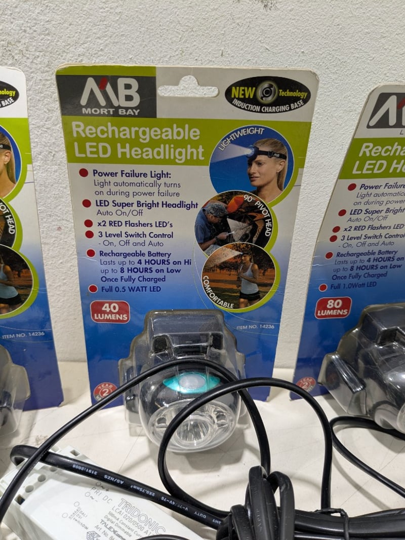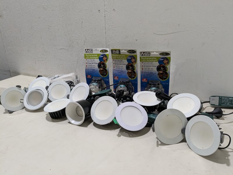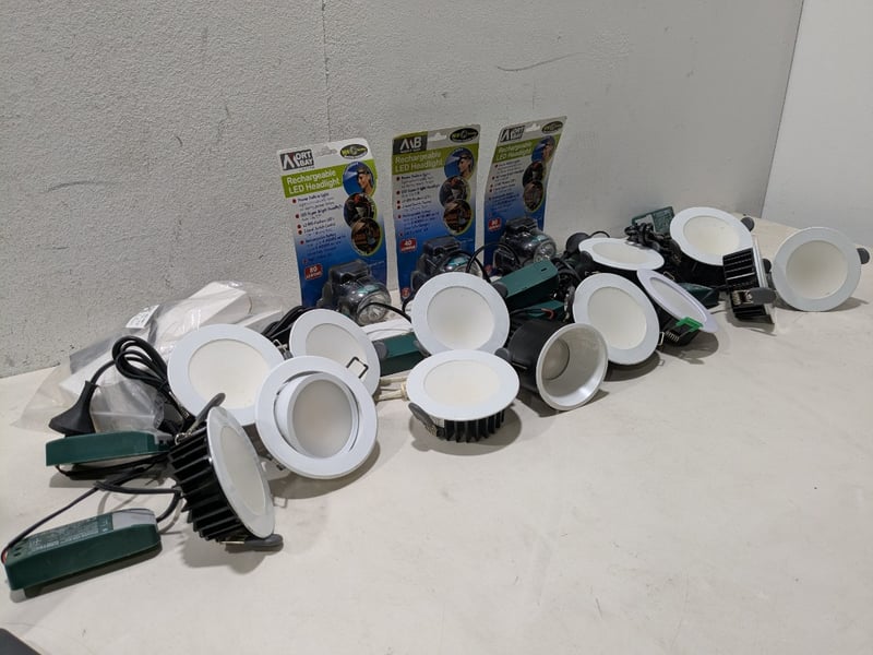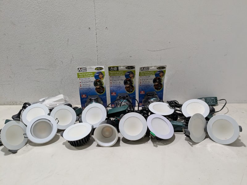 Assorted items include a rechargeable LED headlight, lights, and more...NOTE: Signs of wear and tear, untested.Sold as a lot.