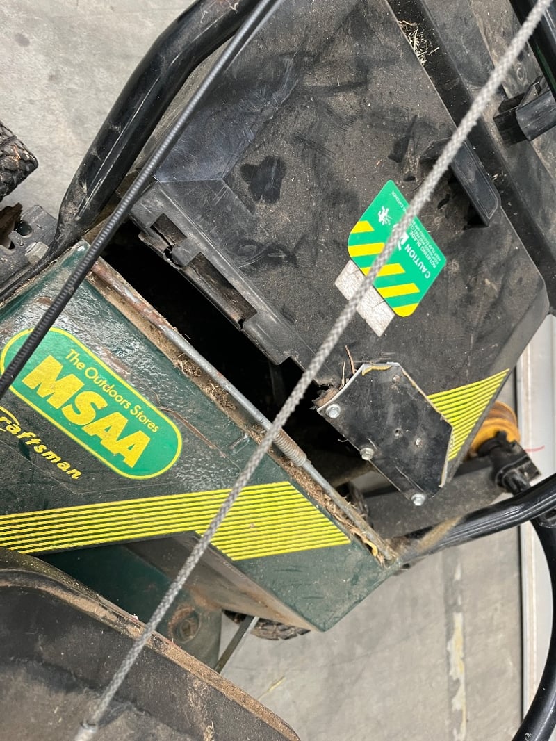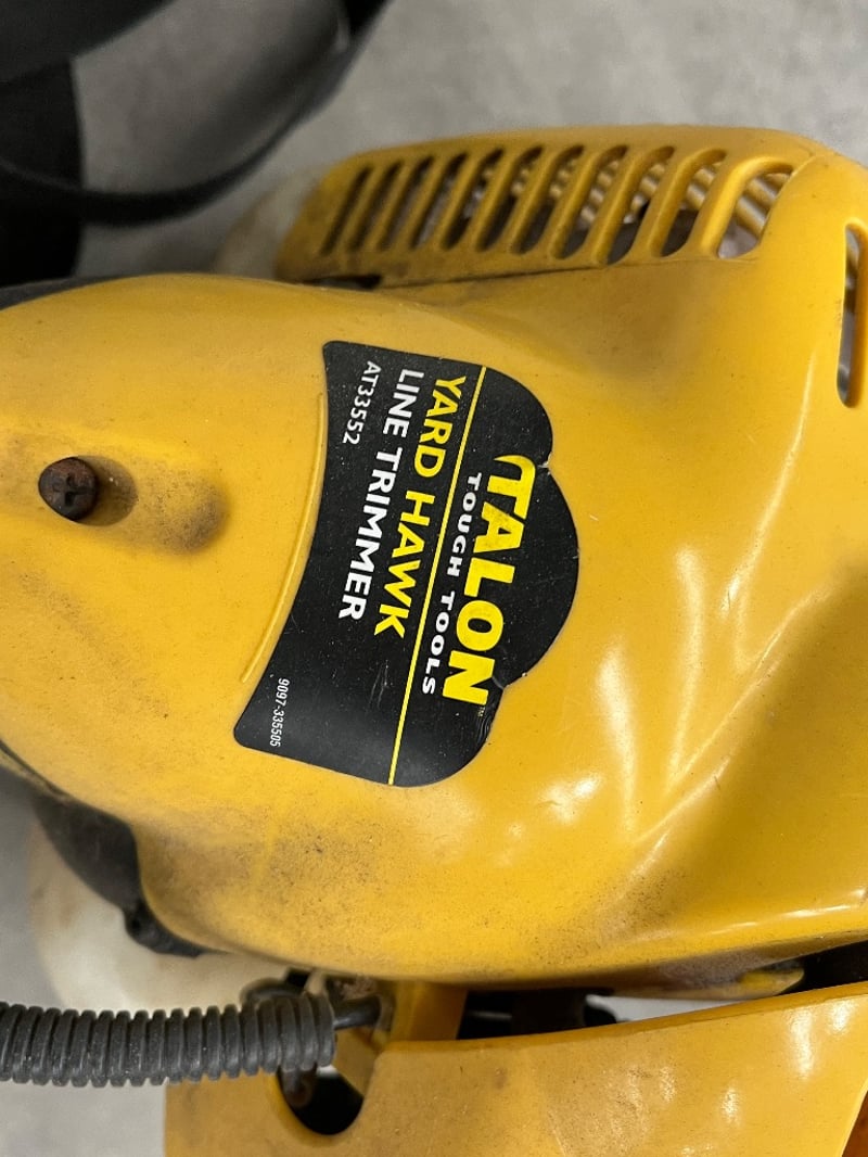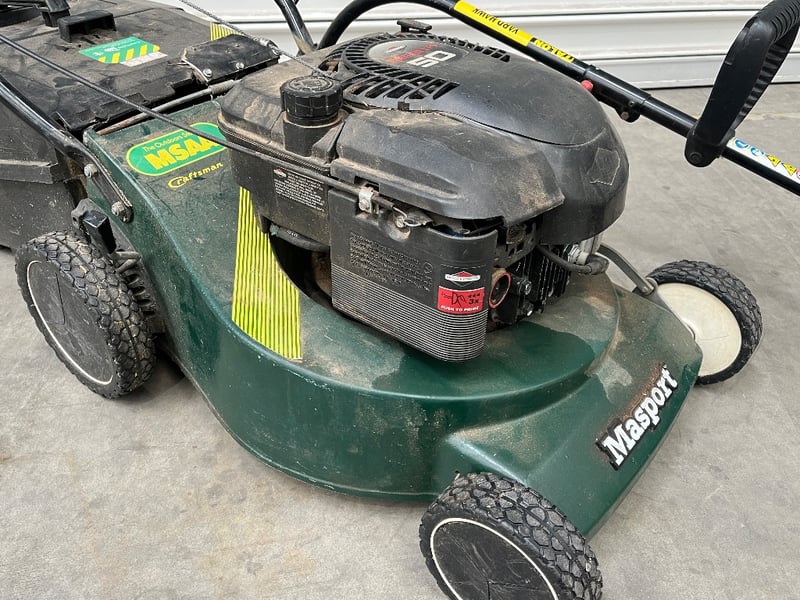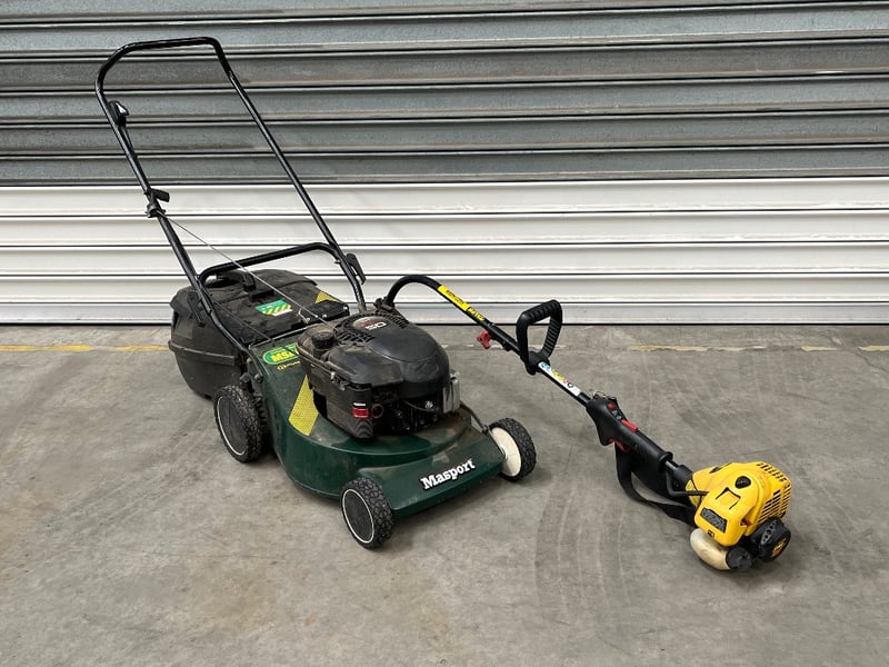 Masport lawn mower package comprising a green petrol-powered rotary mower with Briggs & Stratton engine, push-handle frame with safety bar, and yellow Talon line trimmer attachment. The mower features a compact design suitable for residential gardens, mounted on four pneumatic wheels with tread pattern. Includes integrated grass collection system and engine-mounted controls. The line trimmer attachment connects via shaft coupling for edging and trimming tasks. Equipment shows signs of regular use with surface wear and grass staining consistent with active garden maintenance, the grass catcher is broken on the mower.