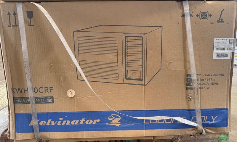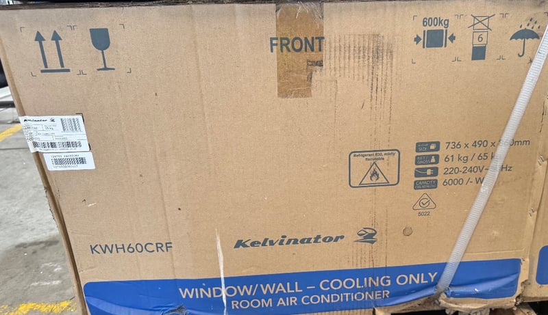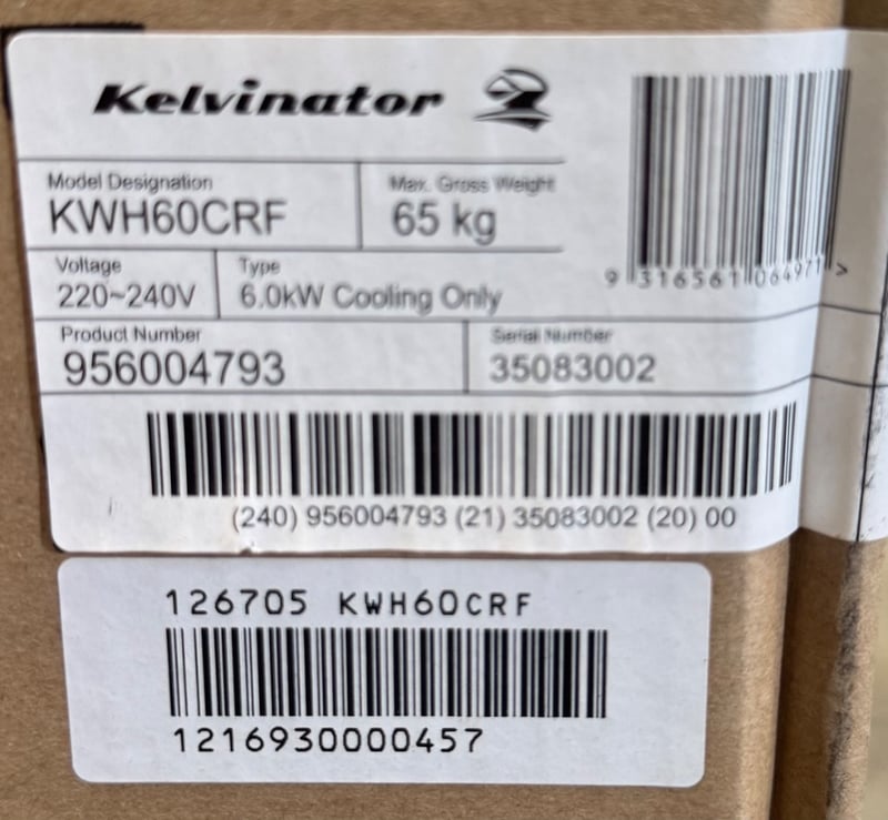 6.0kw Kelvinator Cooling Air Conditioner Model: KWH60CRF Serial No. 35083002 Note: Unused, Carton Damage, No Warranty Applicable.