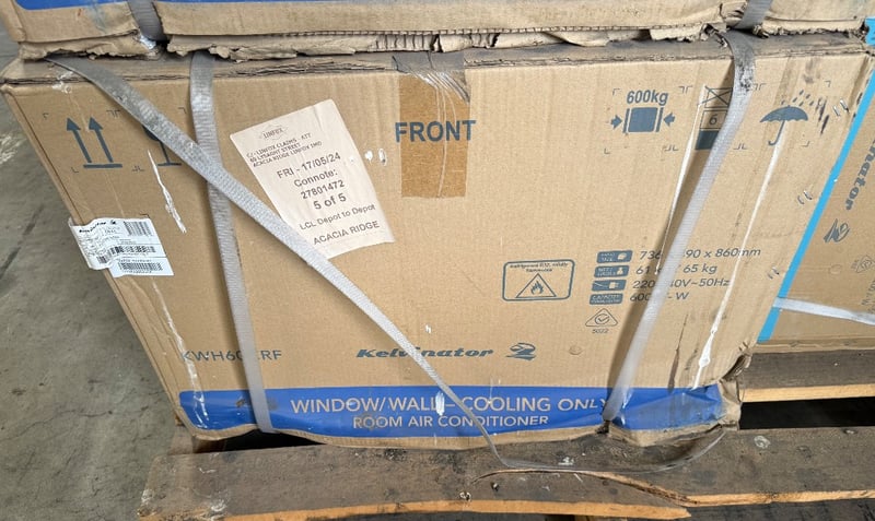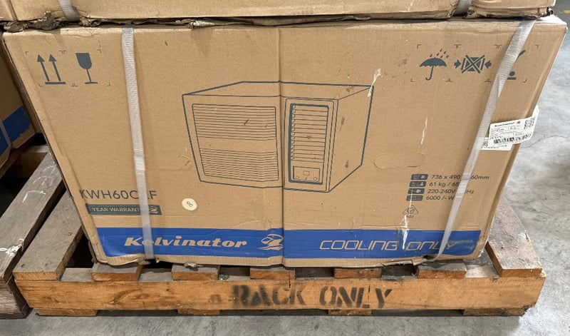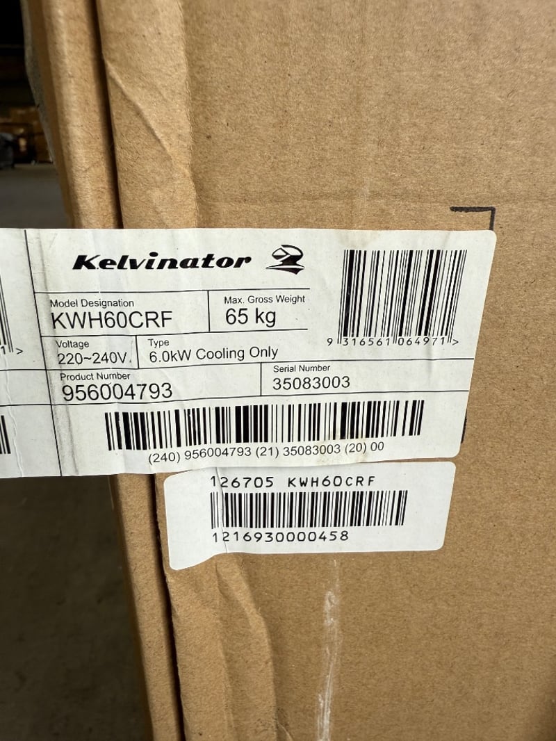 6.0kw Kelvinator Cooling Air Conditioner Model: KWH60CRF Serial No. 35083003 Note: Unused, Carton Damage, No Warranty Applicable.