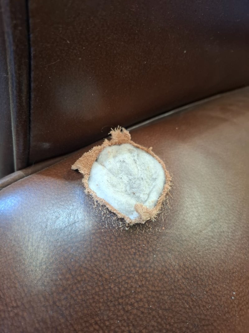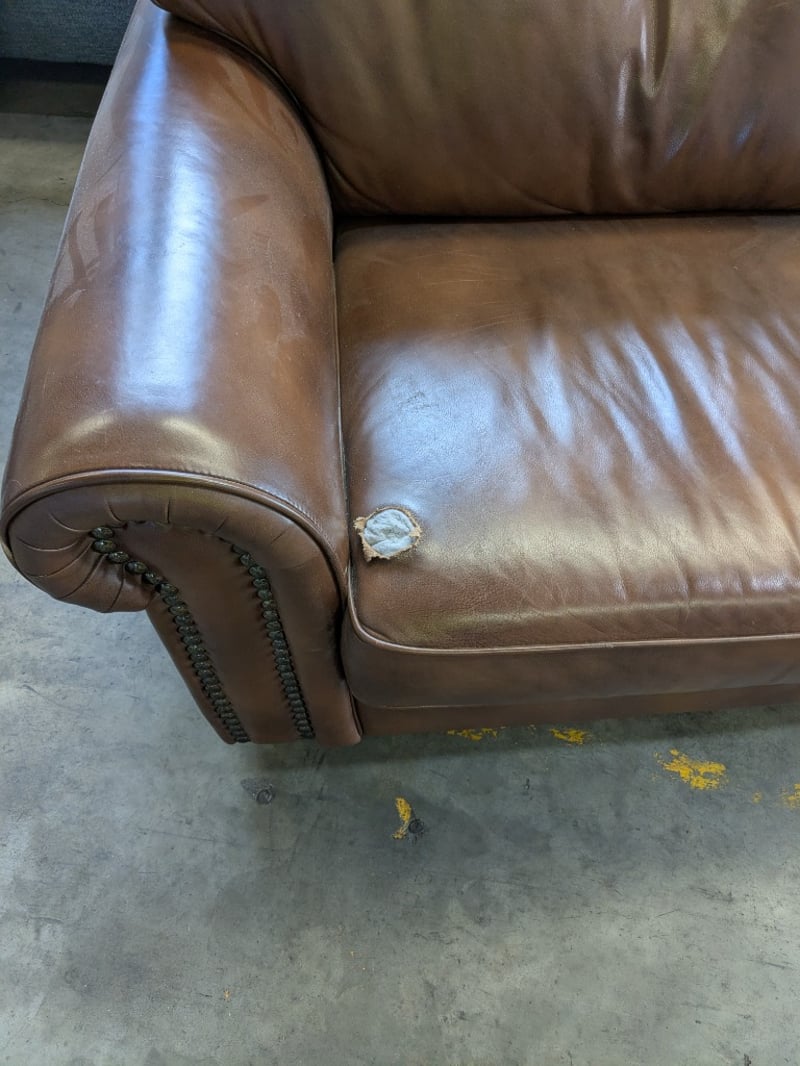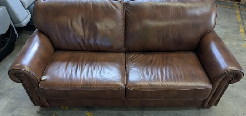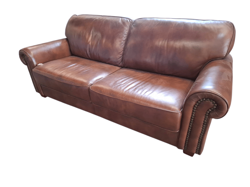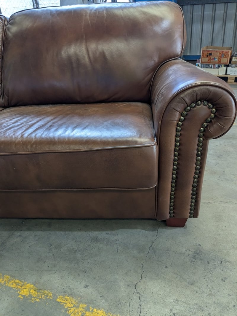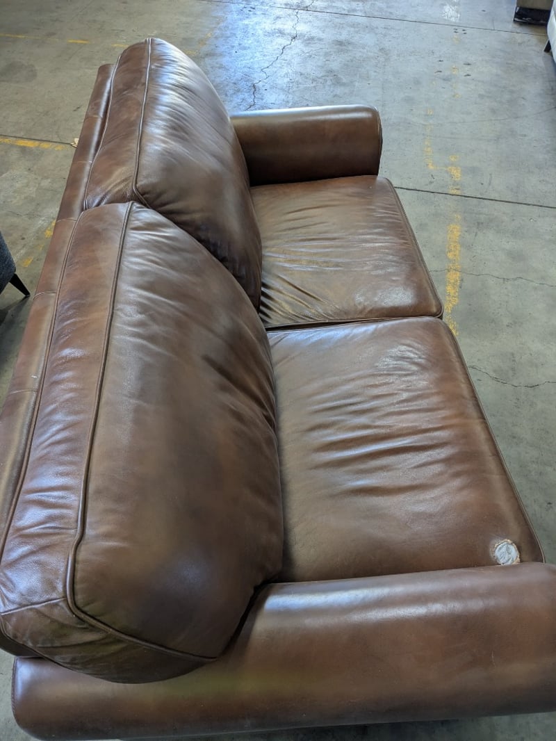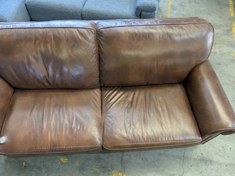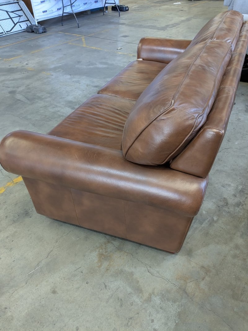 3 Seater Leather Sofa, HazelnutDimension: 209cm(W) x 100cm(D) x 90cm(H)Note: Upholstery Peeling, Marks throughout, Damage/Hole on cushion.