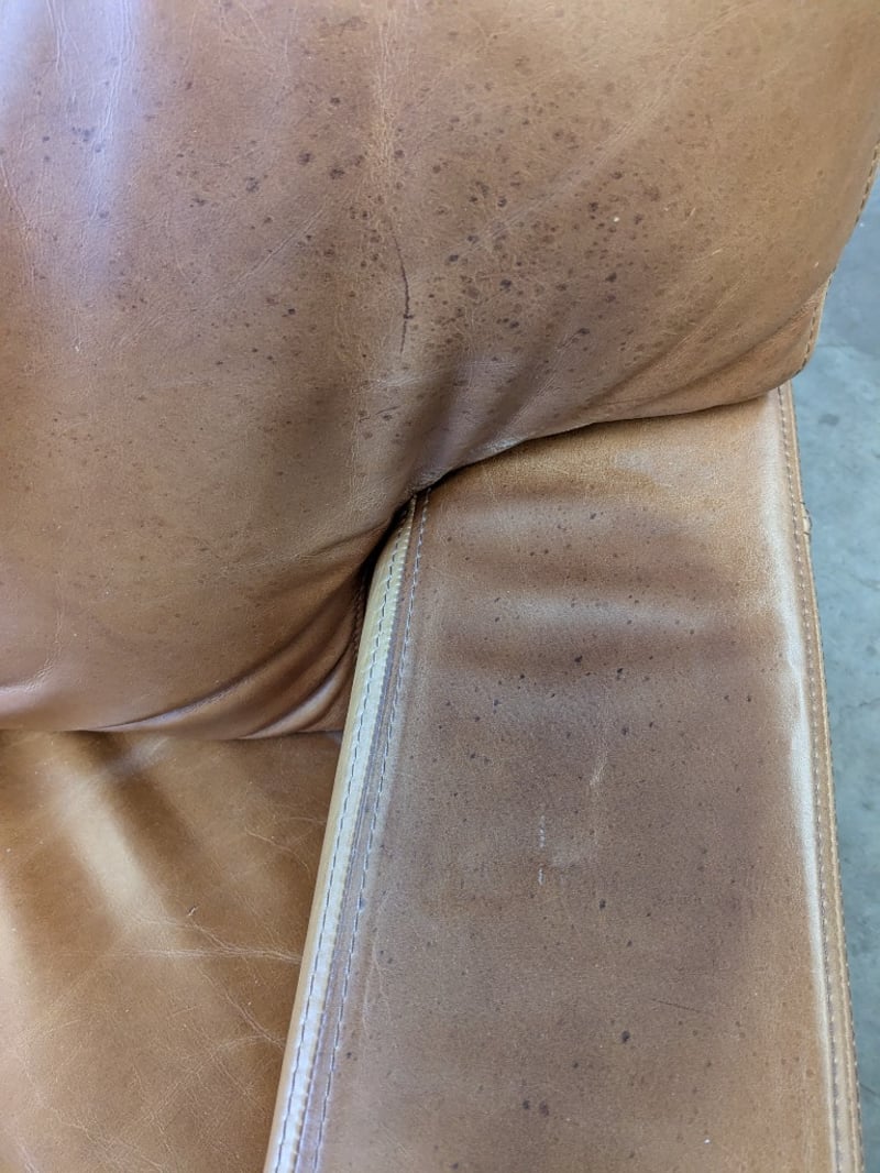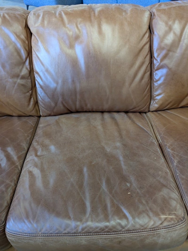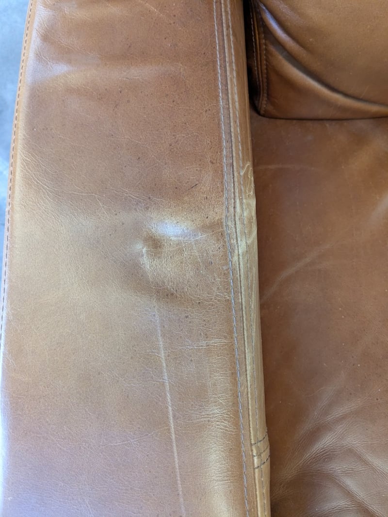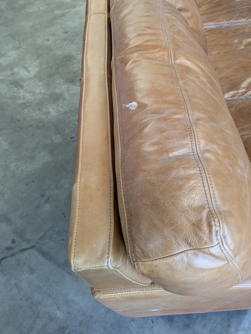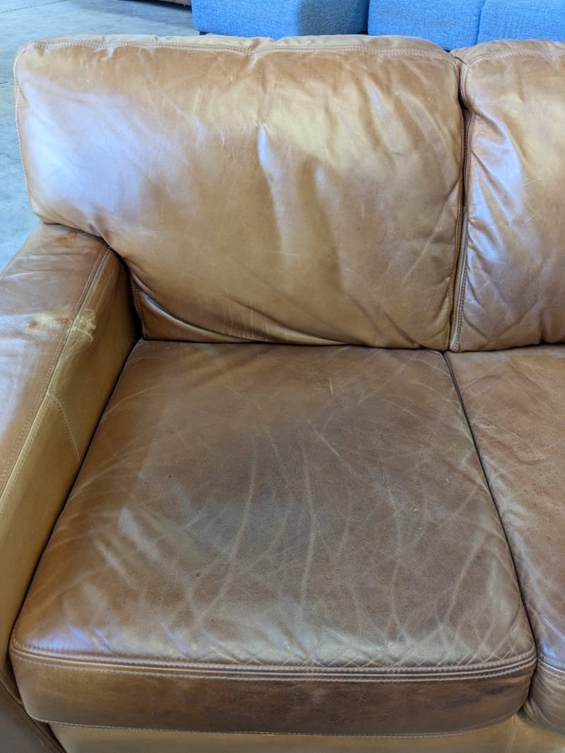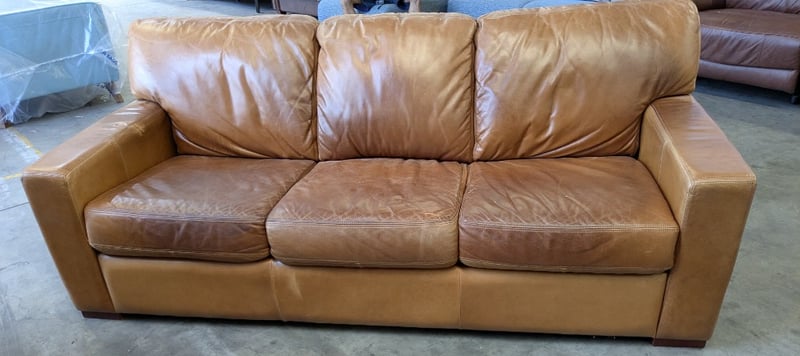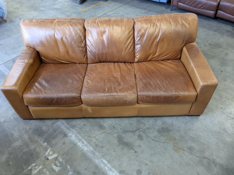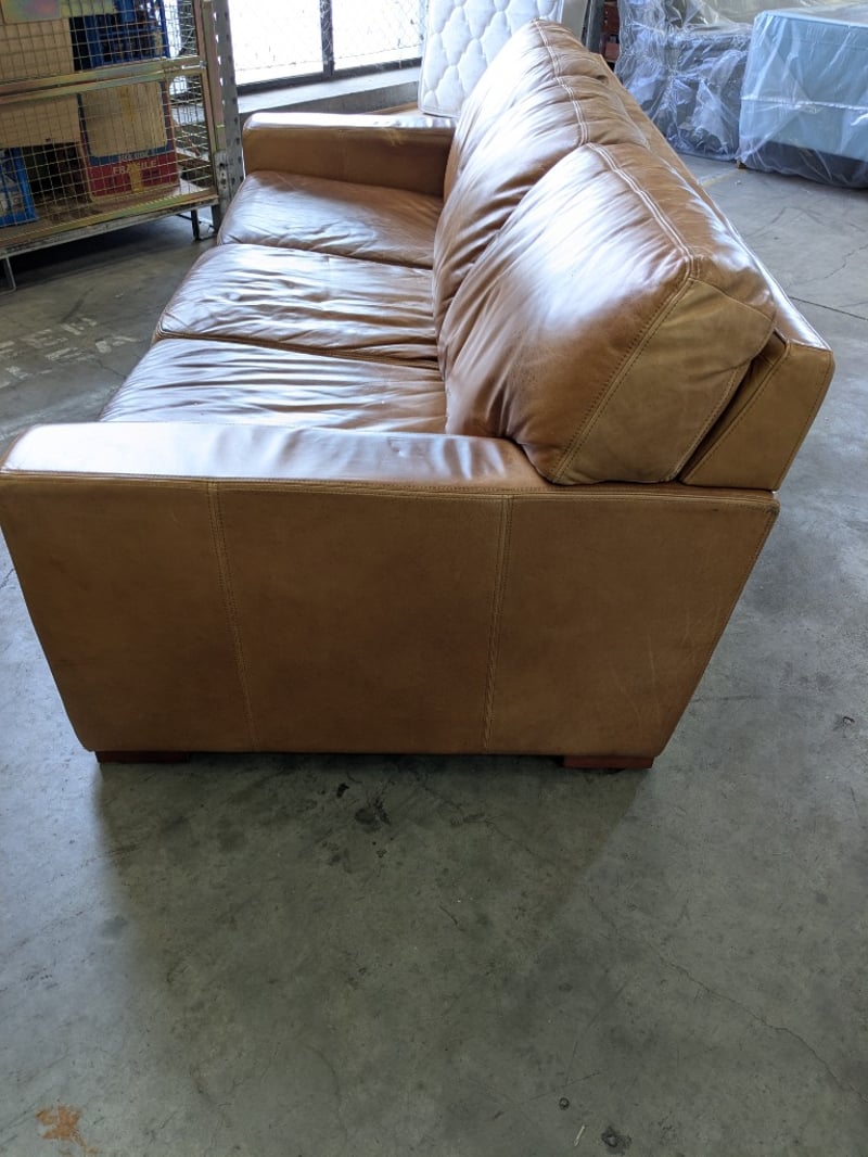 3 Seater Leather Lounge, Caramel Dimension: 214cm(W) x 100cm(D) x 87cm(H)Note: Marks throughout, Very worn.