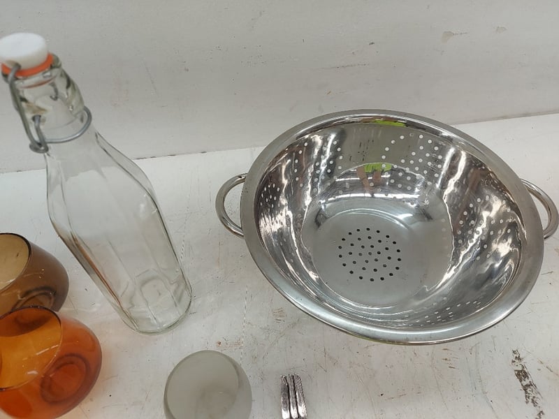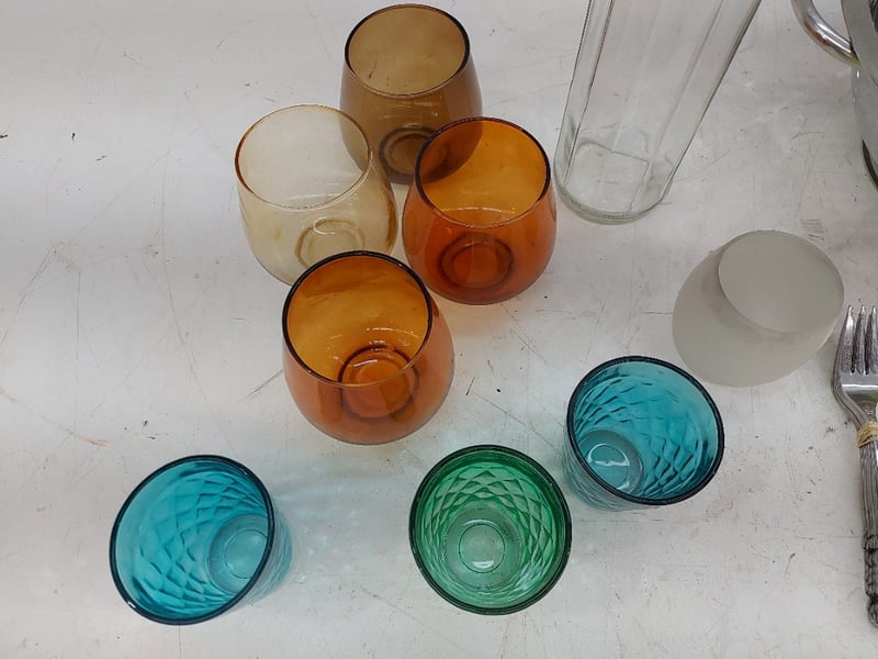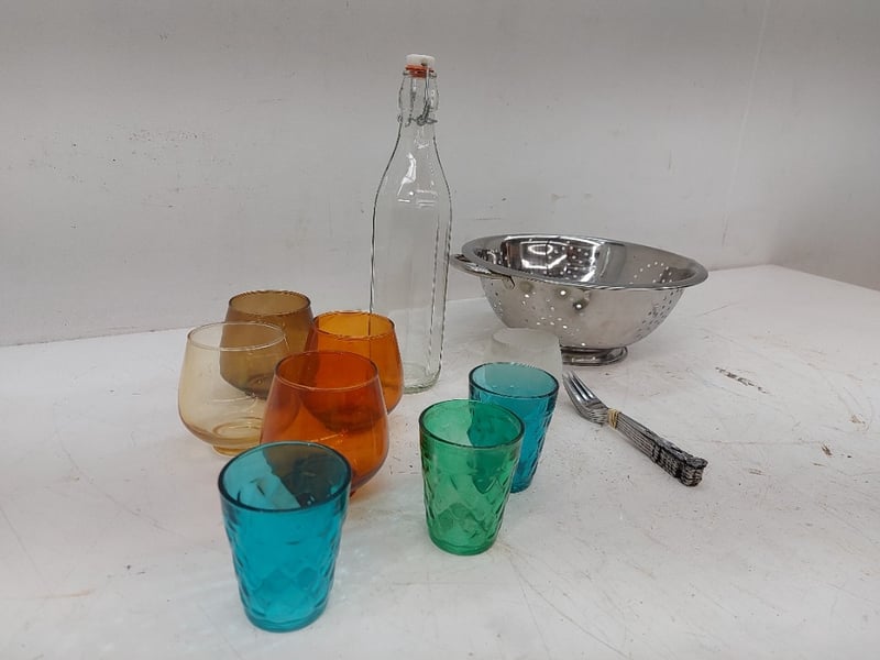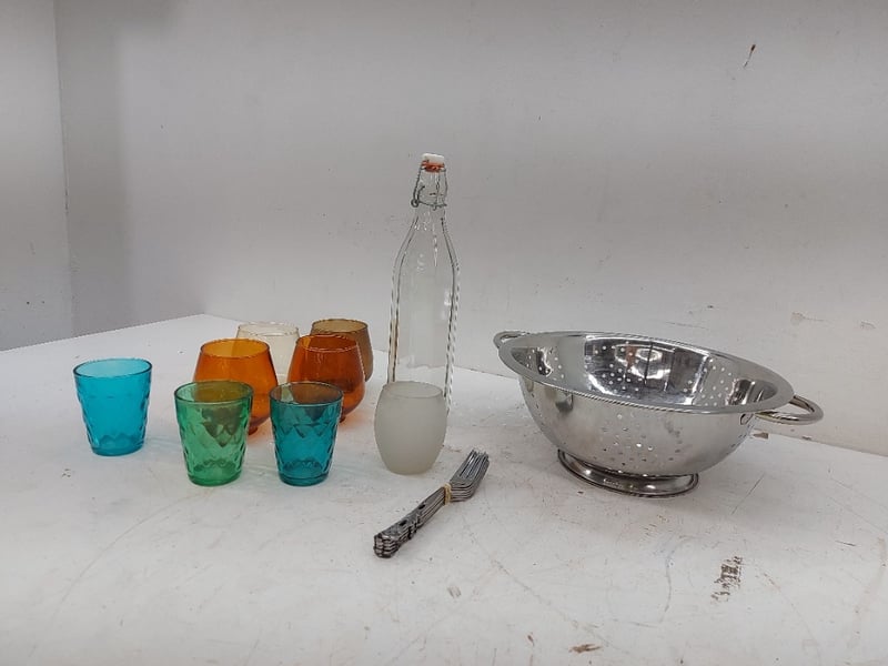 Assorted Lot Includes, Coloured Glass Cups, Forks Stamped Stainless Japan, Glass Water Jug, Colander, Quantity 11