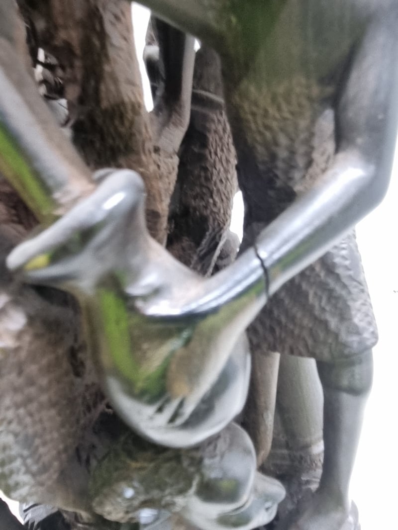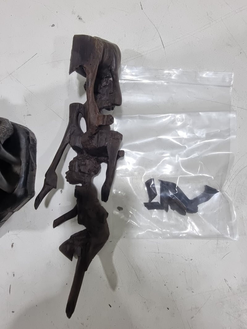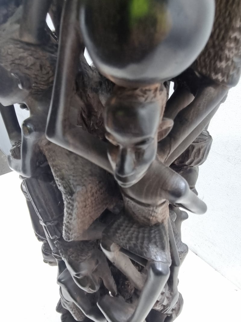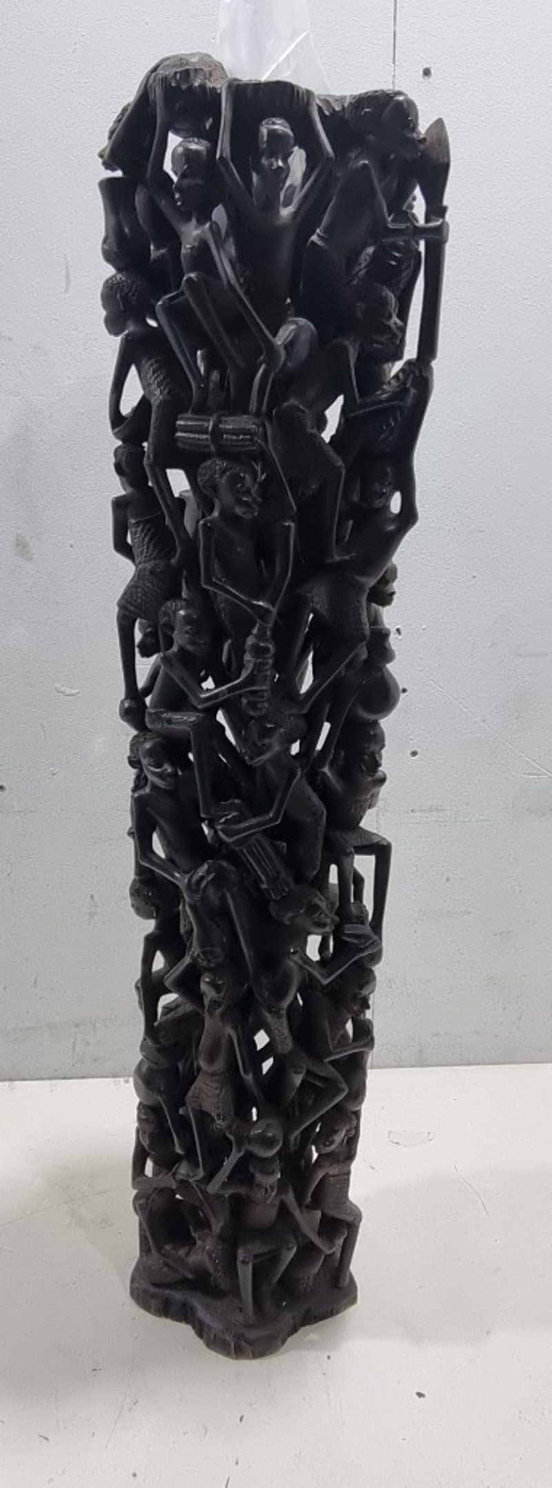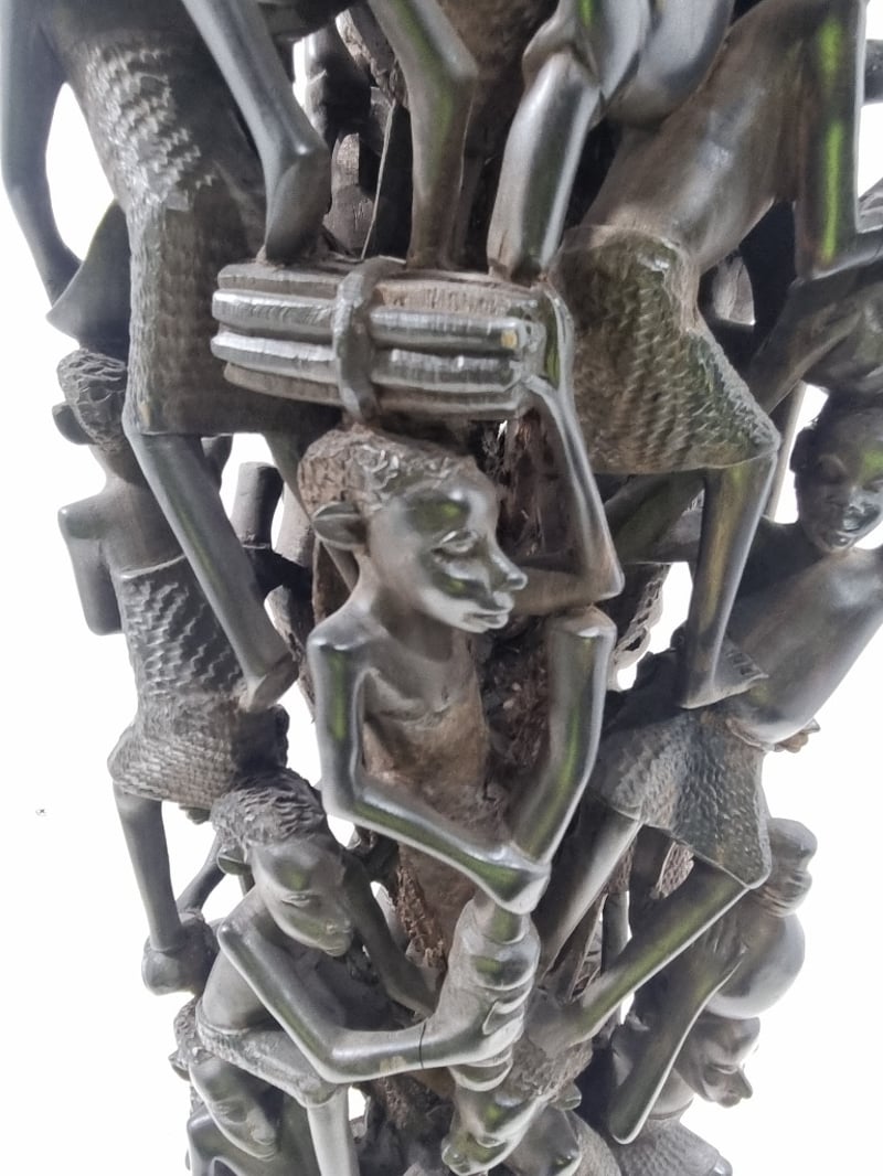 Intricately carved African wooden totem sculpture featuring stacked figures with detailed facial features and expressive expressions. The tall columnar form comprises multiple human figures intertwined with geometric elements and decorative bands. Notable details include clear facial carving with defined features, textured hair detail, and pierced openwork sections creating negative space throughout the composition. The piece displays traditional hand-carving techniques with visible tool marks and natural wood grain. Note : Broken piece and some minor crack (refer to photos )