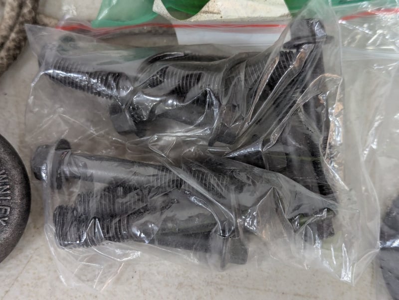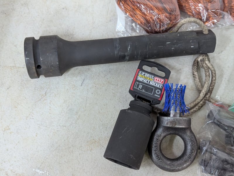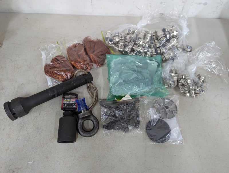 Assorted hardware items, includes cable connectors, bolts (M10x1.5x65), impact socket and copper coloured wireSOLD AS LOT