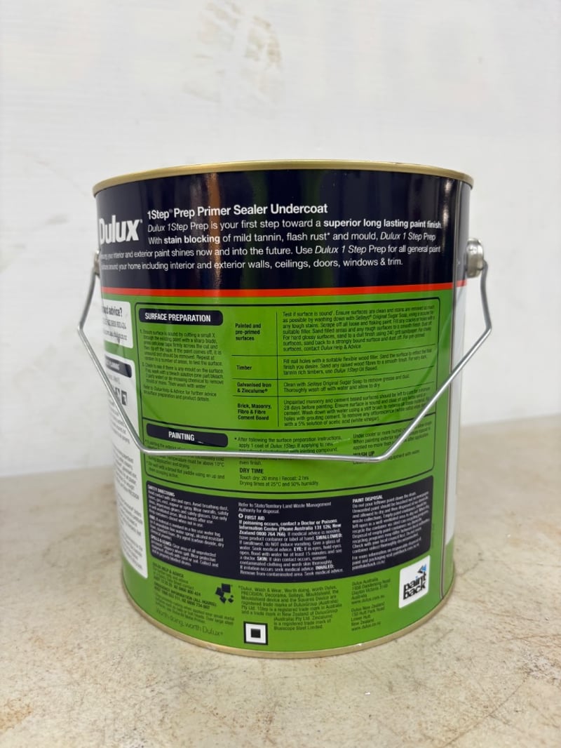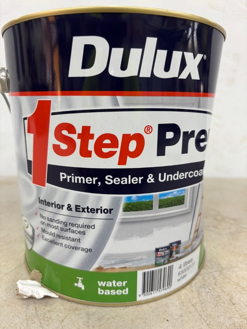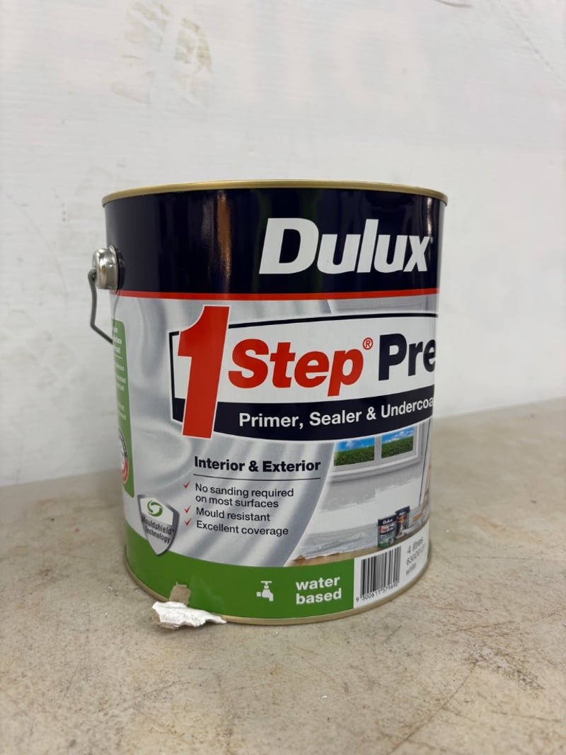 Paint, Dulux 1 Step Prep, Primer Sealer and Undercoat, Interior and Exterior, Water Based White, 4L