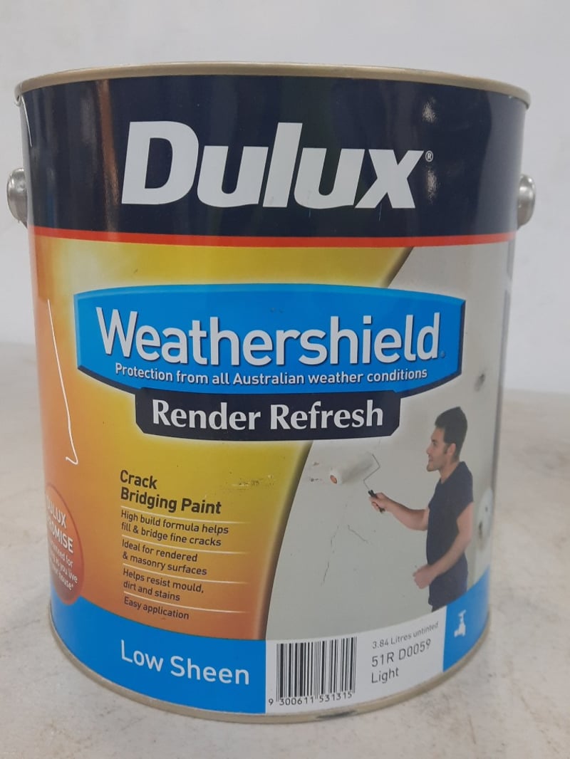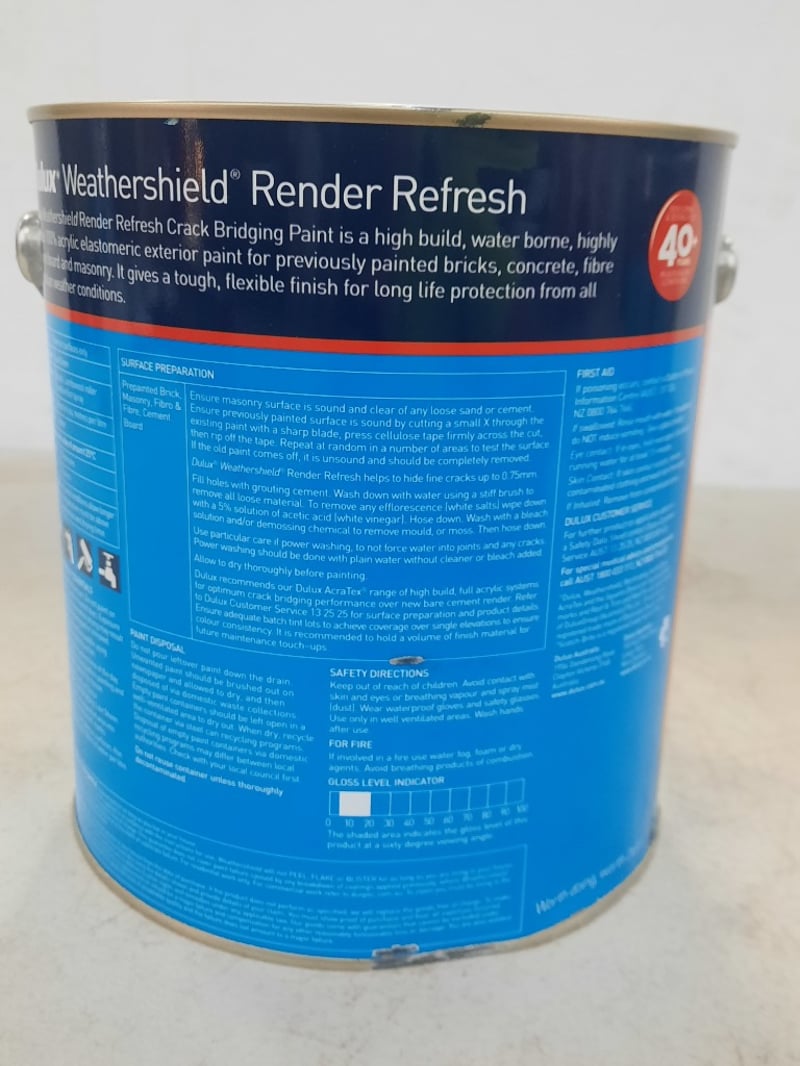 Paint, Dulux Weathershield Render refresh, Low Sheen untinted 4 LitresBID PER LITRE, MUST TAKE 4 LITRES