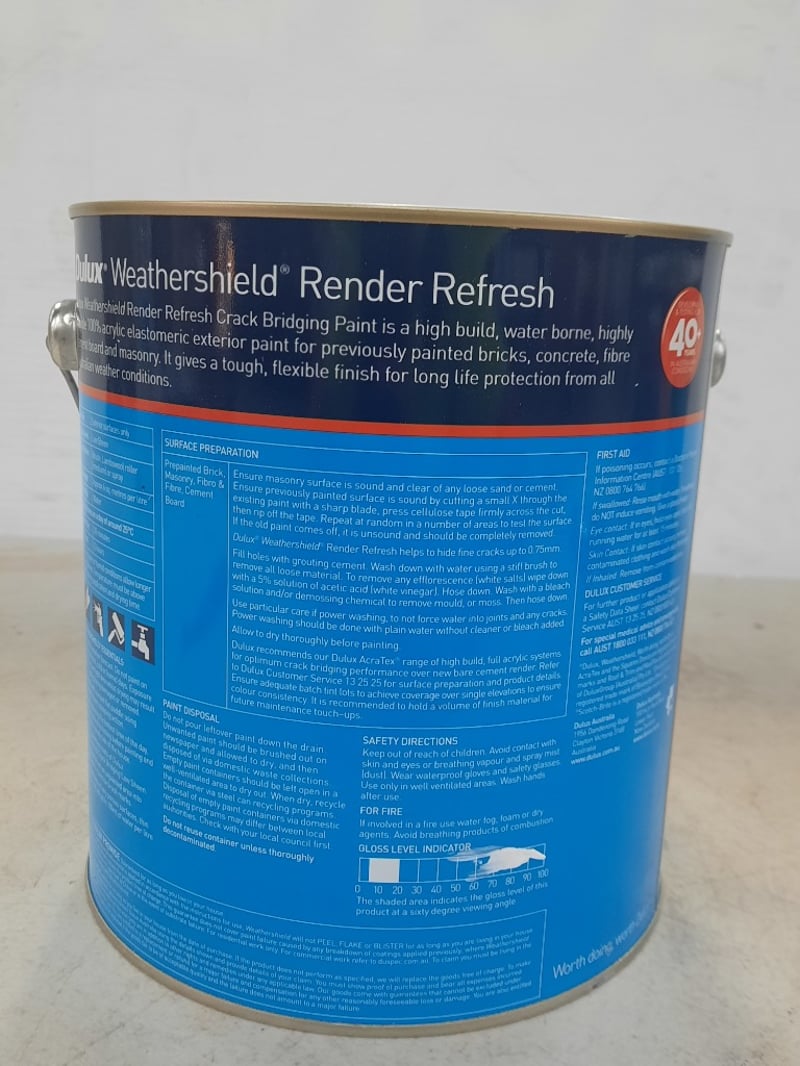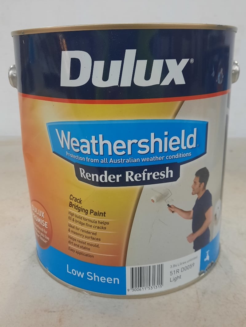 Paint, Dulux Weathershield Render Refresh Low Sheen Untinted 4 LitresBID PER LITRE, MUST TAKE 4 LITRES