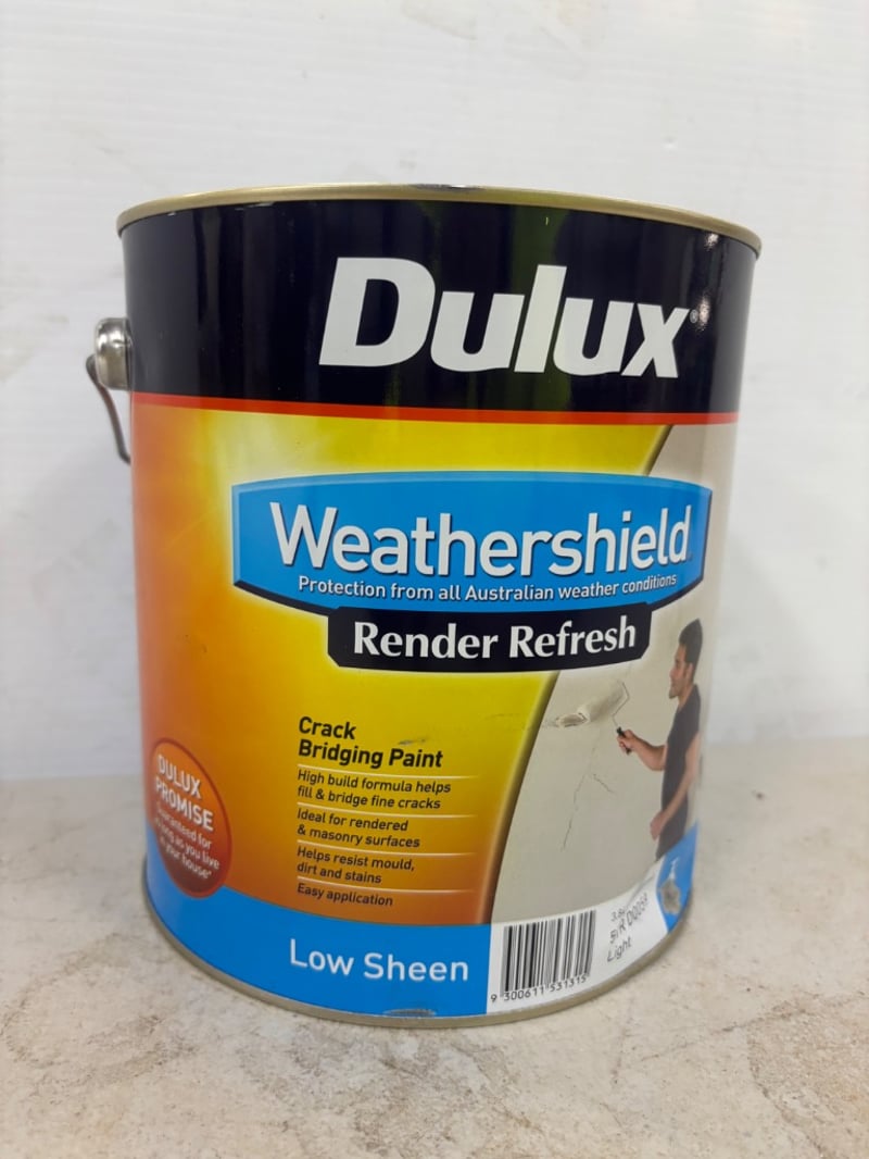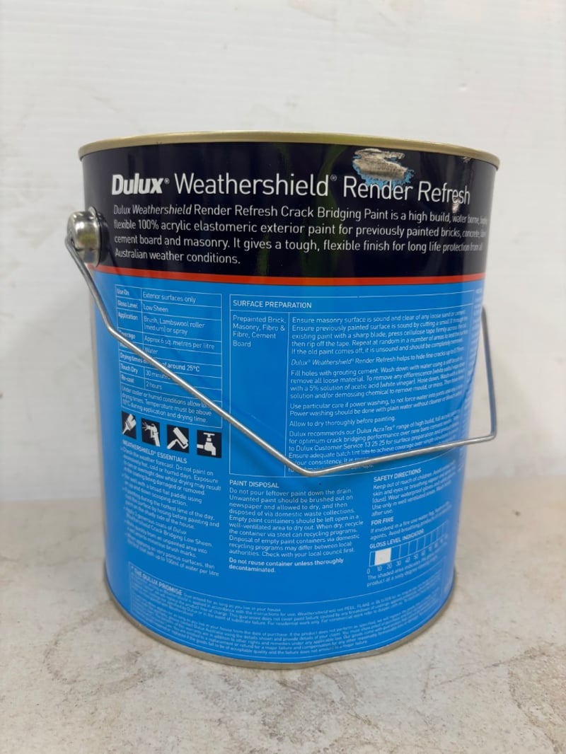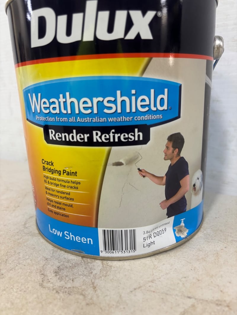 Paint, Dulux Weathershield, Render Refresh, Low Sheen, Light, Untinted 4 LitresBID PER LITRE, MUST TAKE 4 LITRES