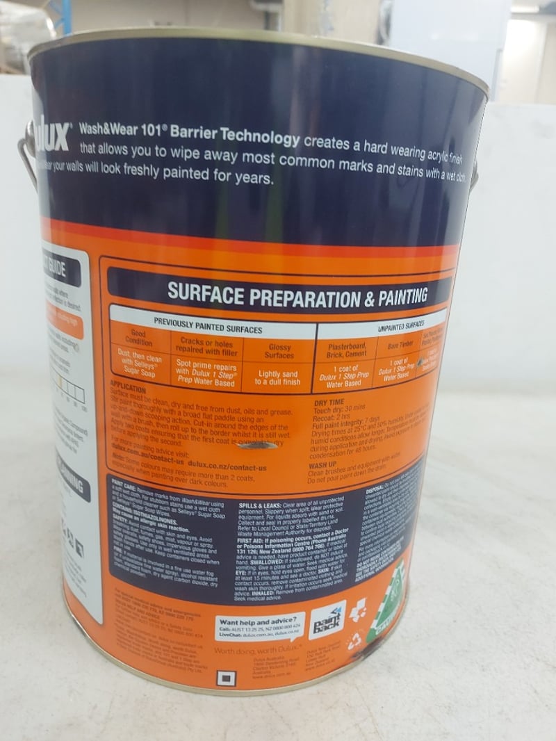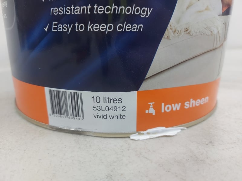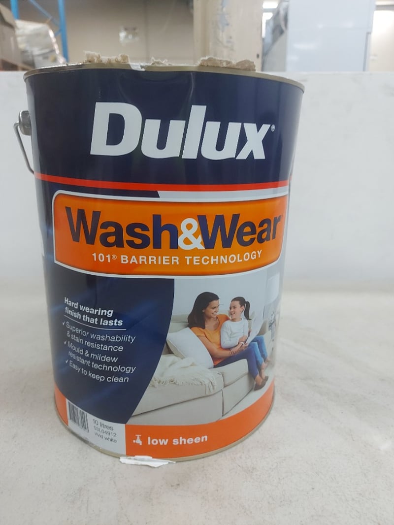 Paint, Dulux, Wash & Wear, vivid White, low sheen, 10LBID PER LITRE, MUST TAKE 10 LITRES
