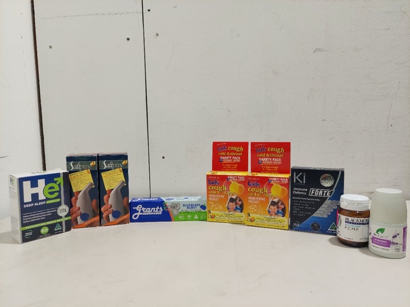 A collection of various health and wellness products, including: Kids cough lozenges, He deep sleep and more.