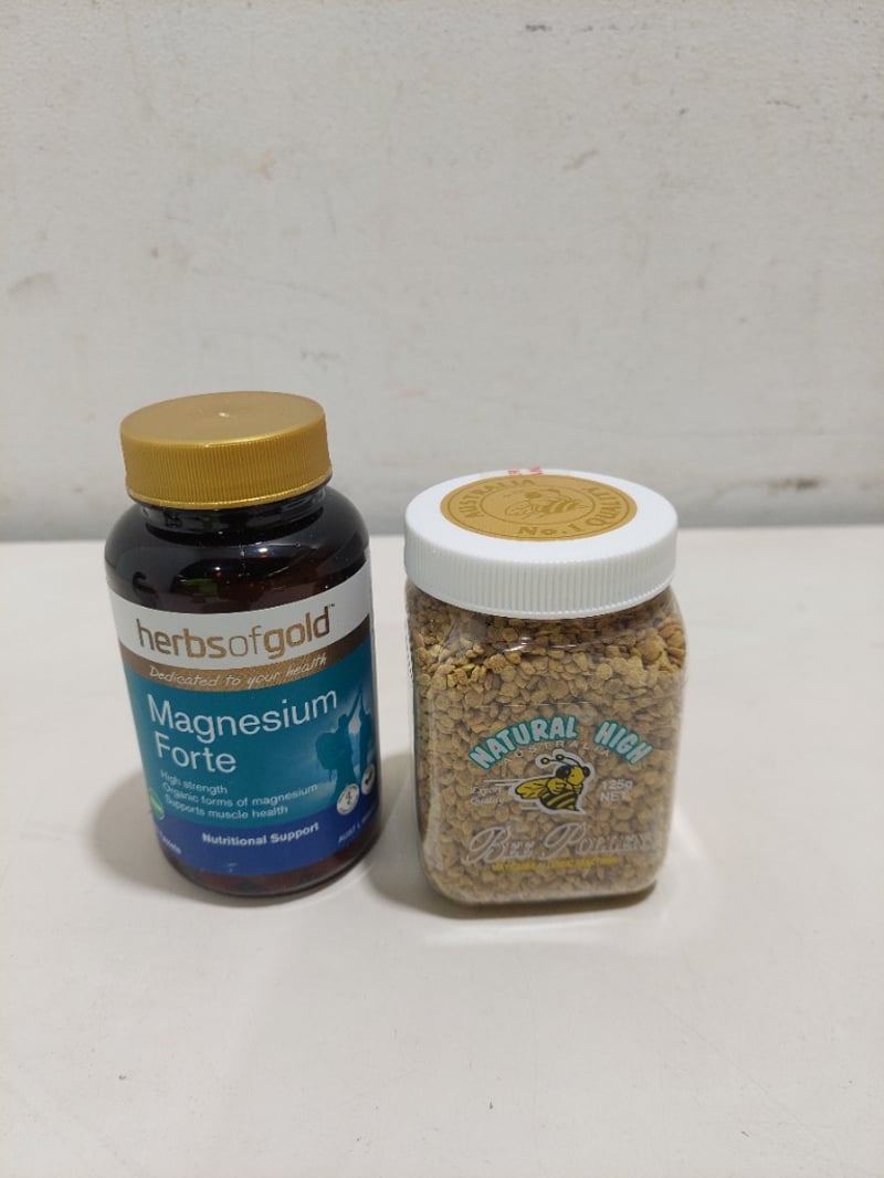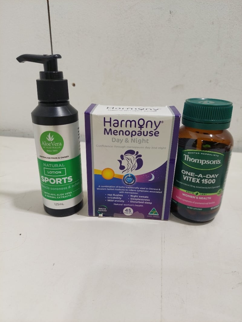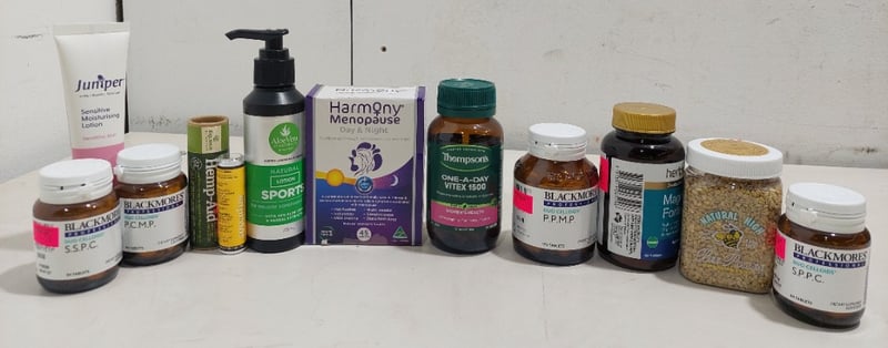 A collection of various health and wellness products, including: Hemp aid, Natural high bee pollen, Hormony menopause day and night and more.
