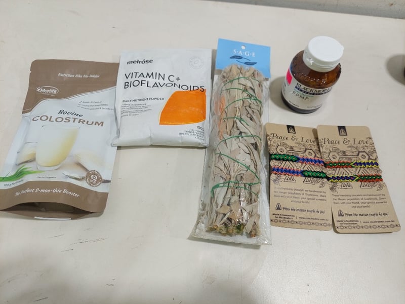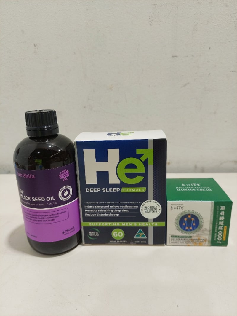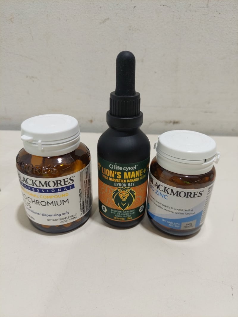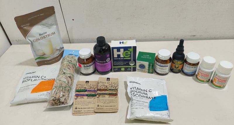 A collection of various health and wellness products, including: Life cykel lions mane, He deep sleep and more.