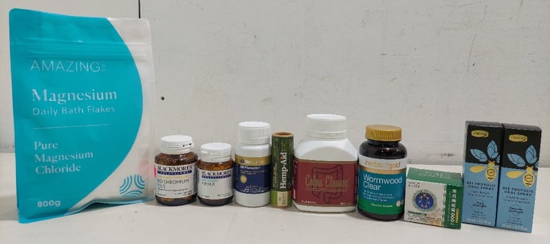 A collection of various health and wellness products, including: Amazing magnesium bath flakes, Hemp-aid and more.