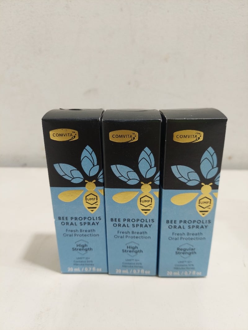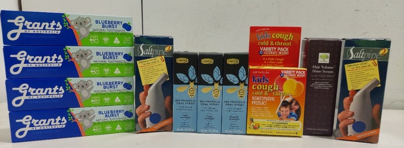 A collection of various health and wellness products, including: Bee propolis oral spray, kids cough lozenges and more.Sold as a lot.