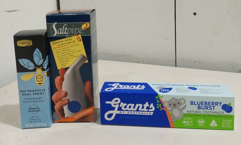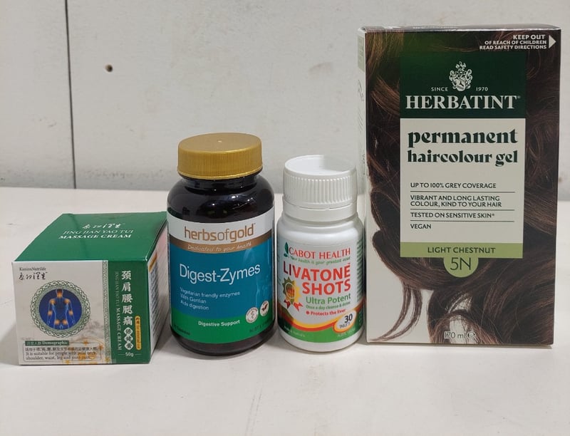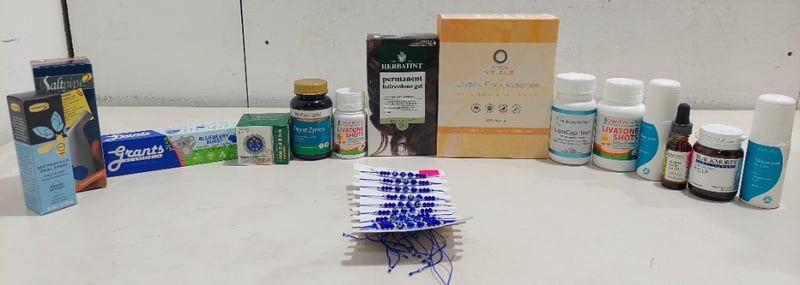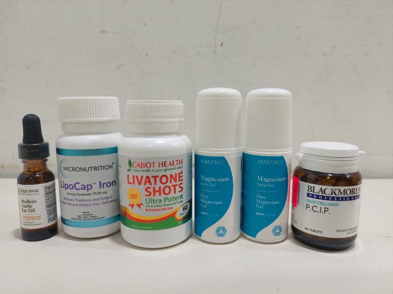 A collection of various health and wellness products, including: Byron naturals detox foot patches, Mullein garlic ear oil and more.
