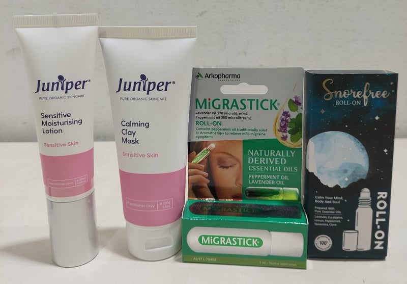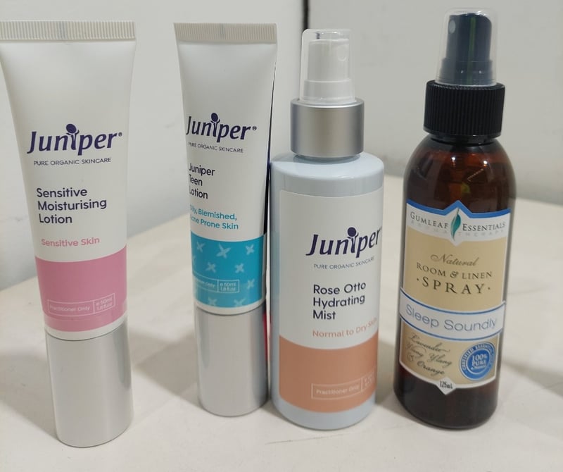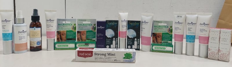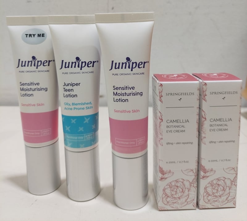 Assorted health and wellness products, including: Juniper senaitive moisturising lotion, springfields camellia botanical eye cream and more.