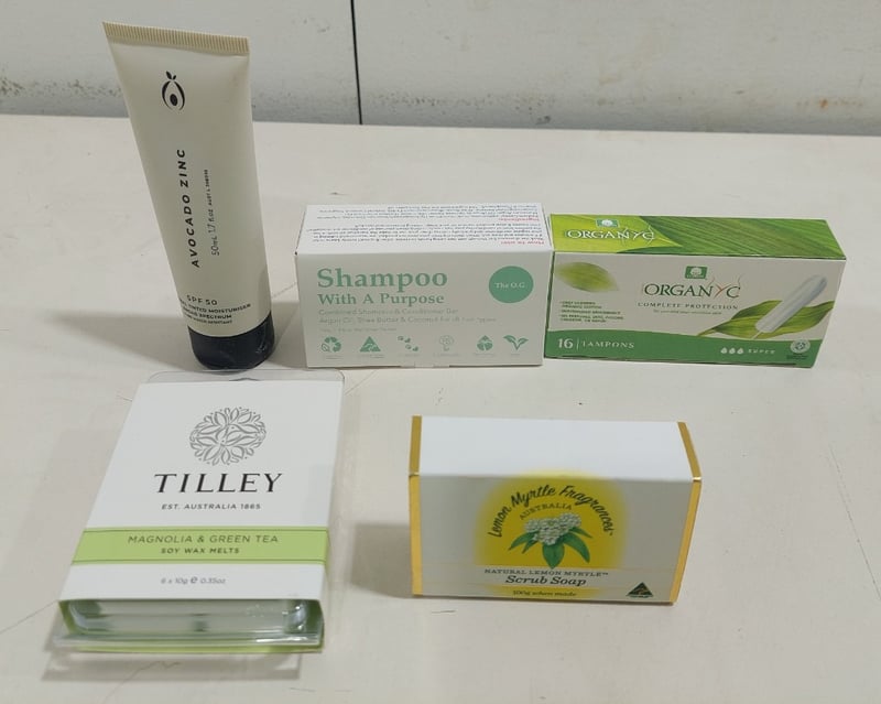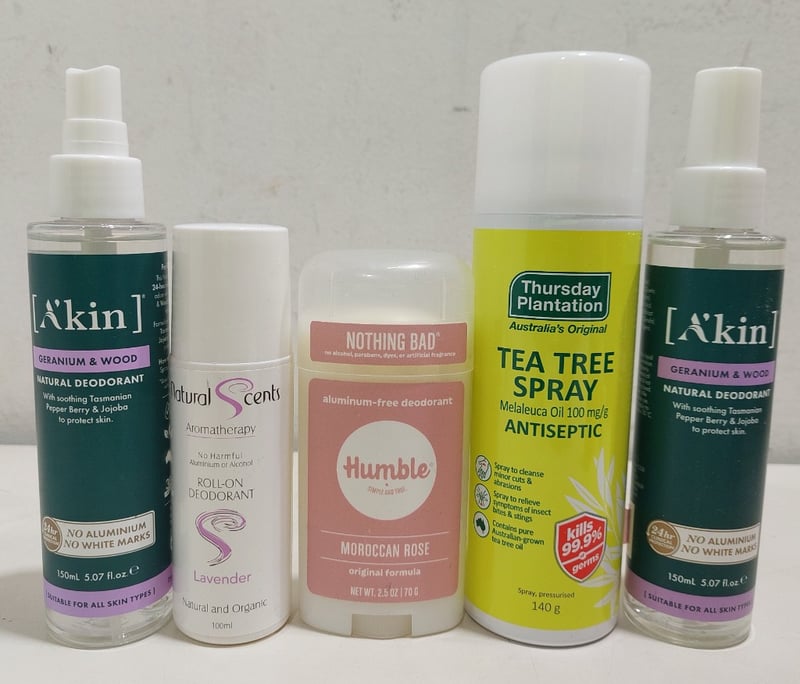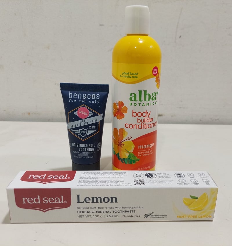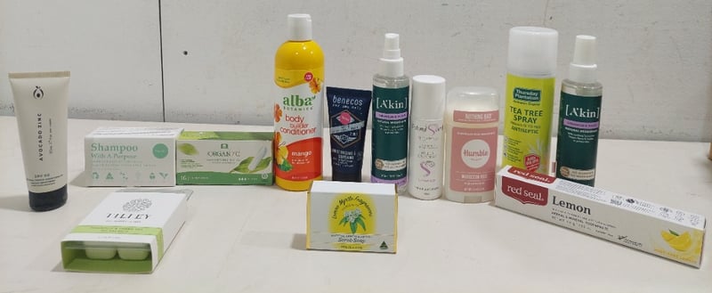 Assorted health and wellness products, including: alba botanical body builder conditioner, tea tree spray antiseptic and more.
