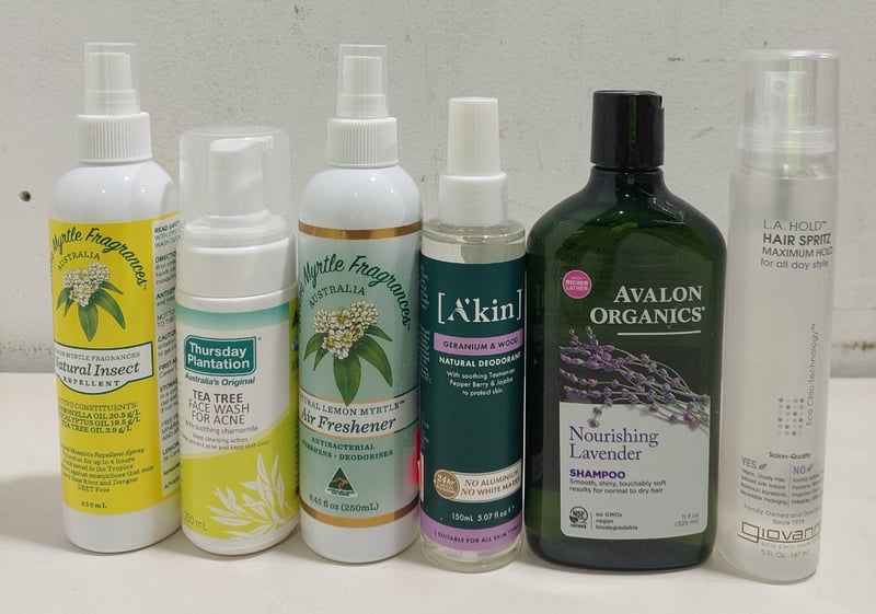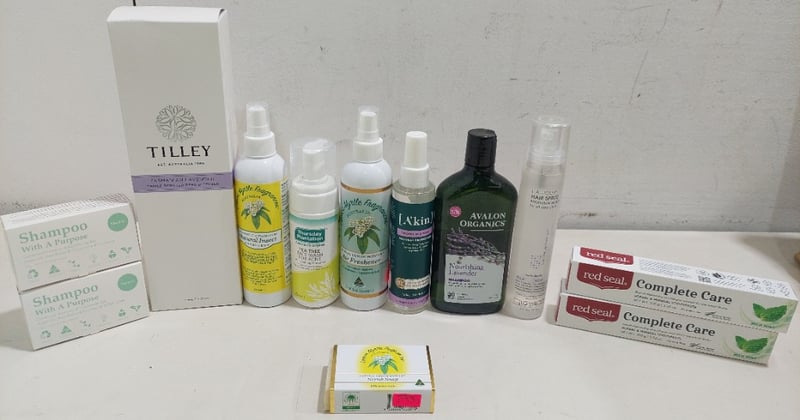 Assorted health and wellness products, including: Lavender shampoo, herbal toothpaste and more.