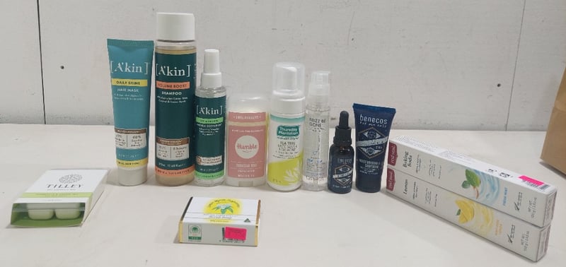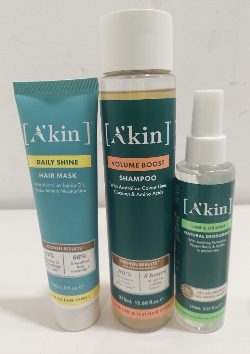 Assorted health and wellness products, including: Akin hair mask, shampoo, natural deodorant and more.Sold as a lot.