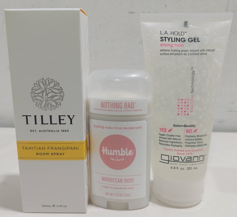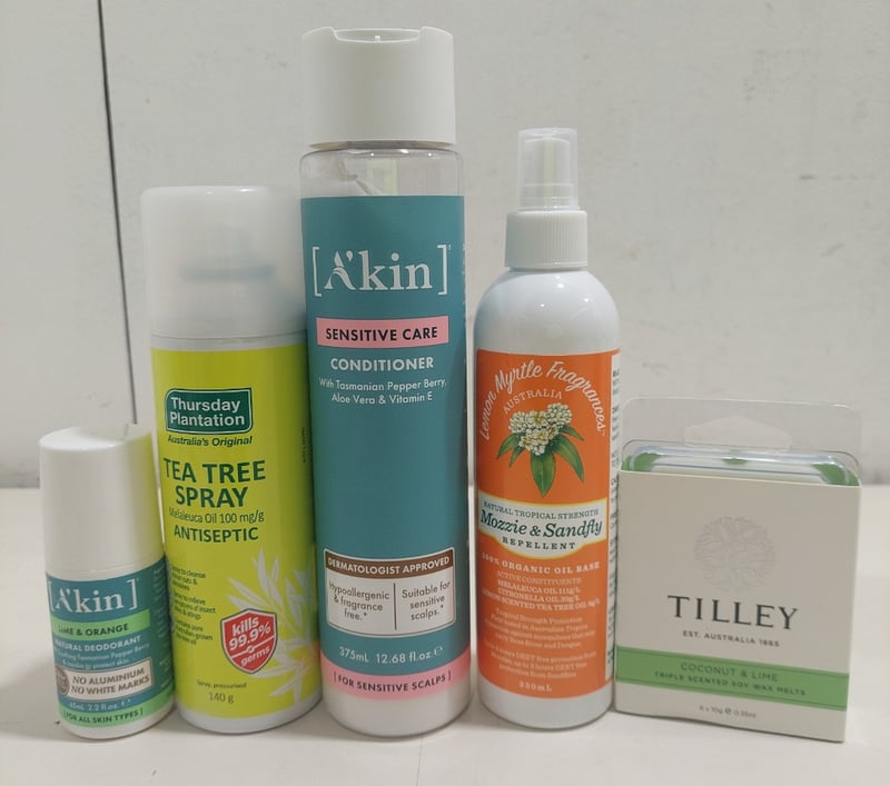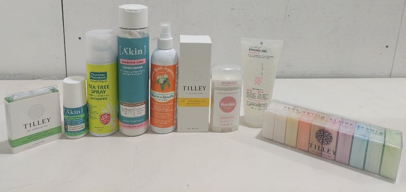 Assorted health and wellness products, including: Akin conditioner, Soap and more.
