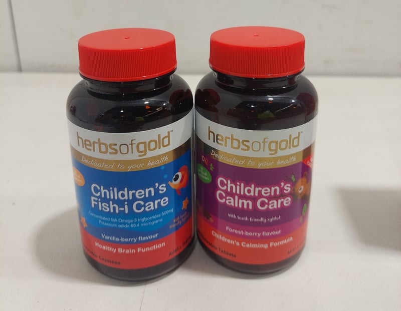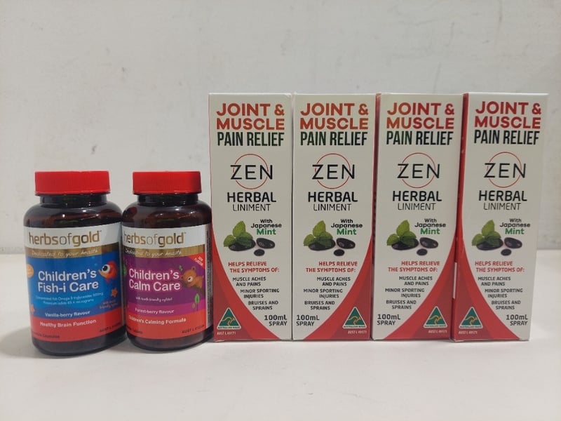 Assorted health and wellnes items including: herbs of gold childrens calm care, joint and muscle pain relief and more.