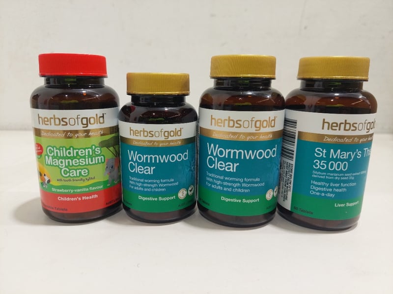 Assorted health and wellnes items including: herbs of gold wormwood clear, childrens magnesium care and more.