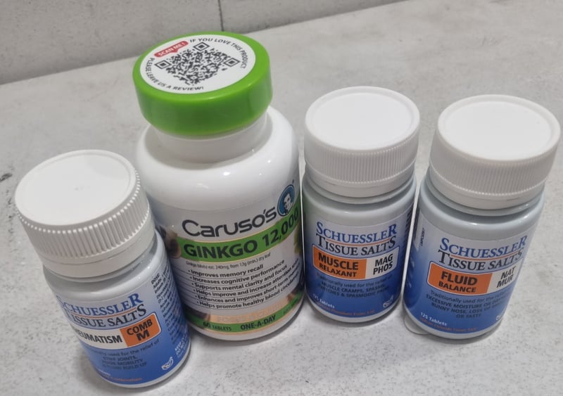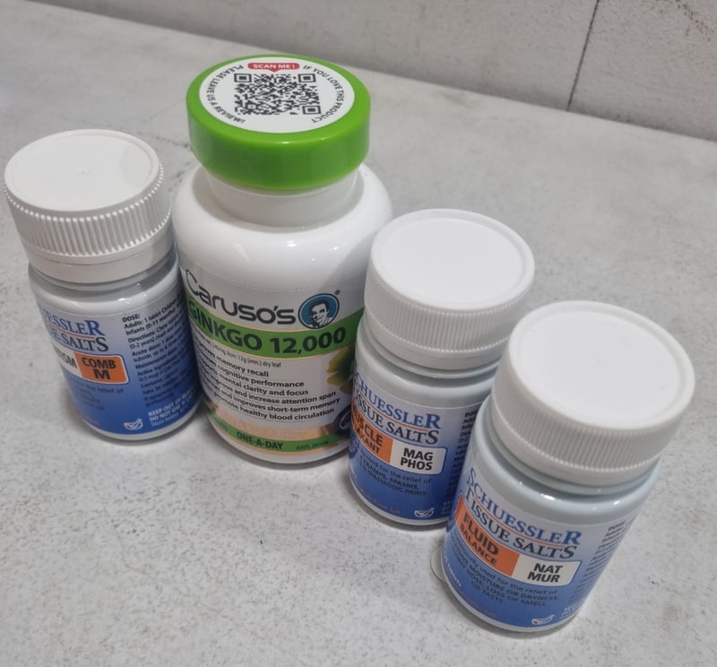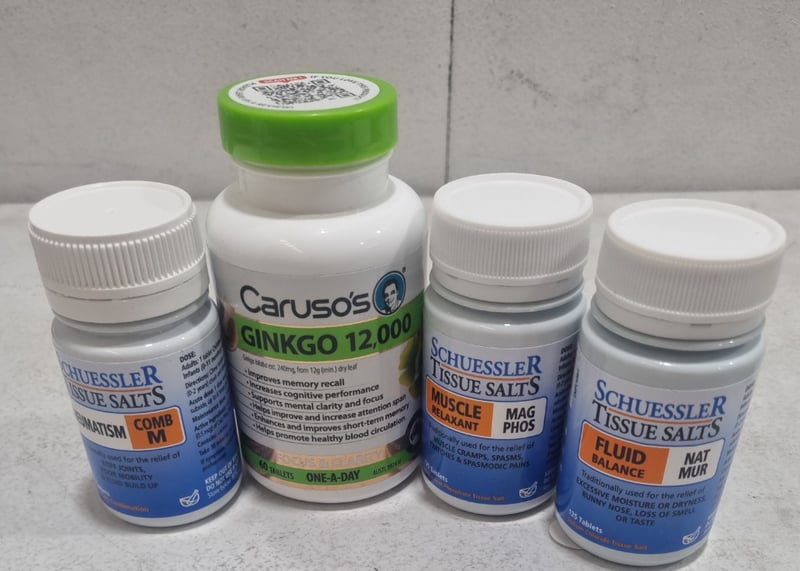 Assorted health and wellness lot, includes Ginko 12000, and schuessler tissue salts.... Sold as lot