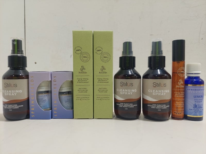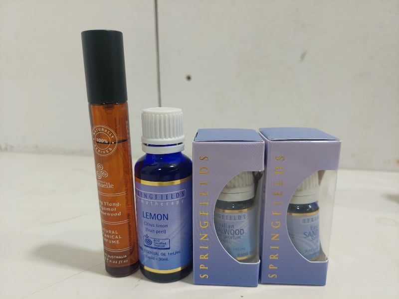 Assorted cosmetic items, including: Rituelle natural botanical perfume, Springfields essential oils and more.