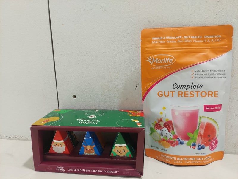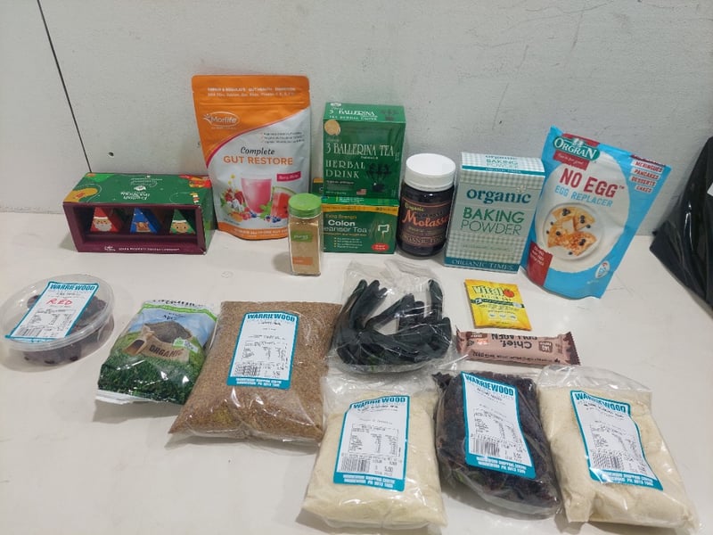 Assorted health and wellness pantry items, including: colon cleanser tea, organic baking powder and more.Sold as a lot.