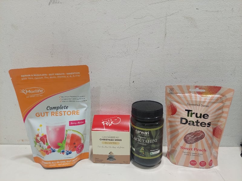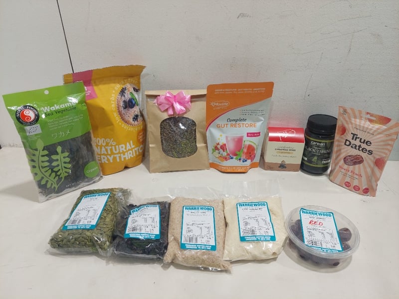 Assorted health and wellness pantry items, including: organic balck tahini, currants and more.Sold as a lot.