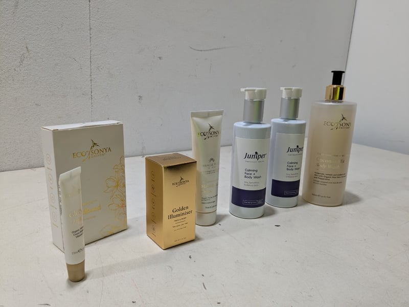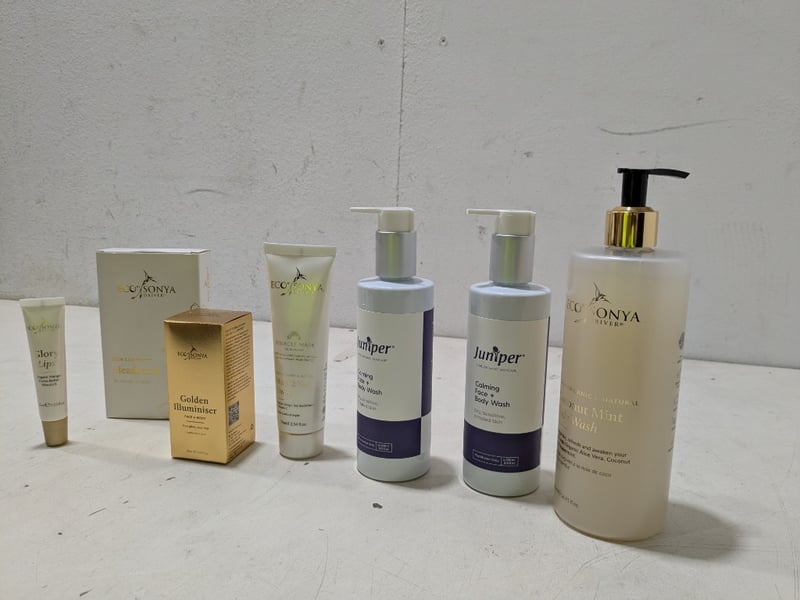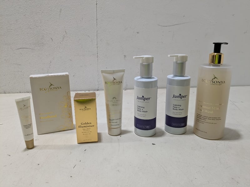 Assorted Juniper pure organic skincare products and Eco by Sonia includes, Calming face + body wash, coconut mint body wash and more...