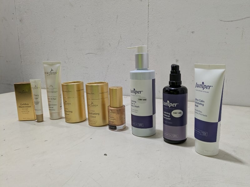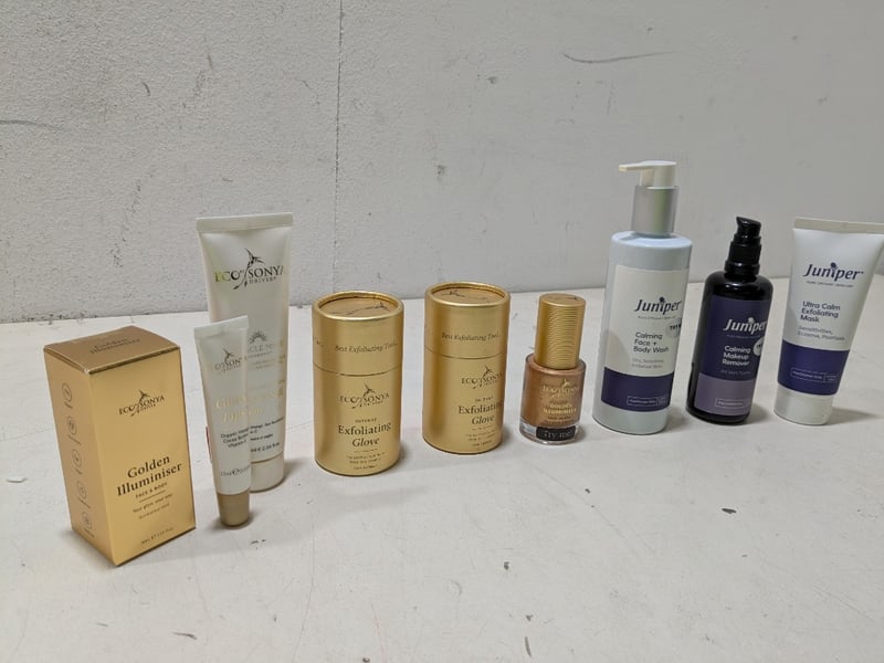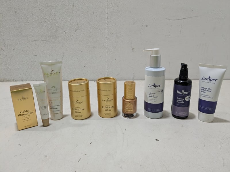 Assorted Juniper pure organic skincare products and Eco by Sonia includes, Calming face + body wash, Golden iluminiser face & body and more...Sold as a lot.