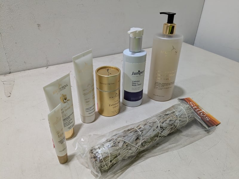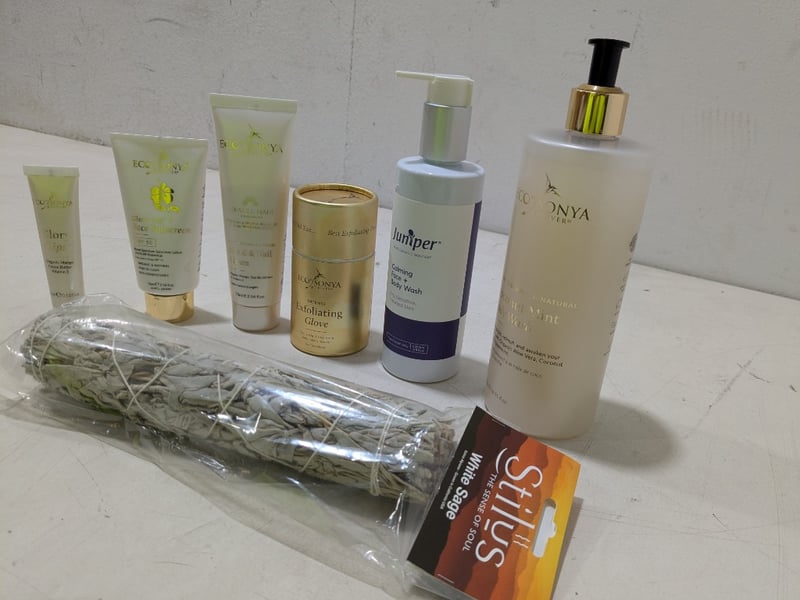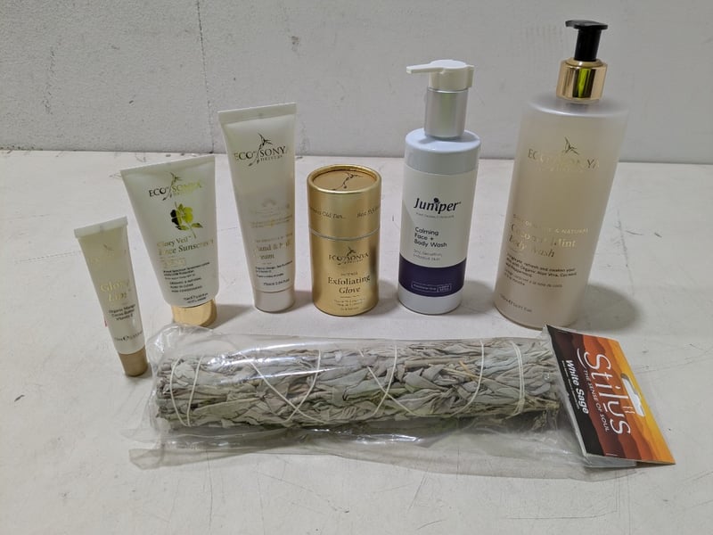 Assorted Juniper pure organic skincare products and Eco by Sonia includes, Calming face + body wash, coconut mint body wash and more...Sold as a lot.