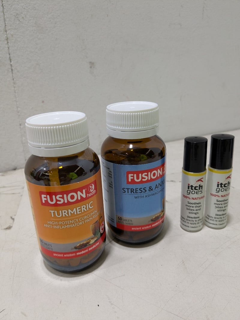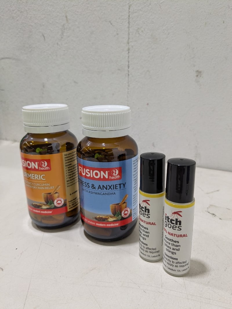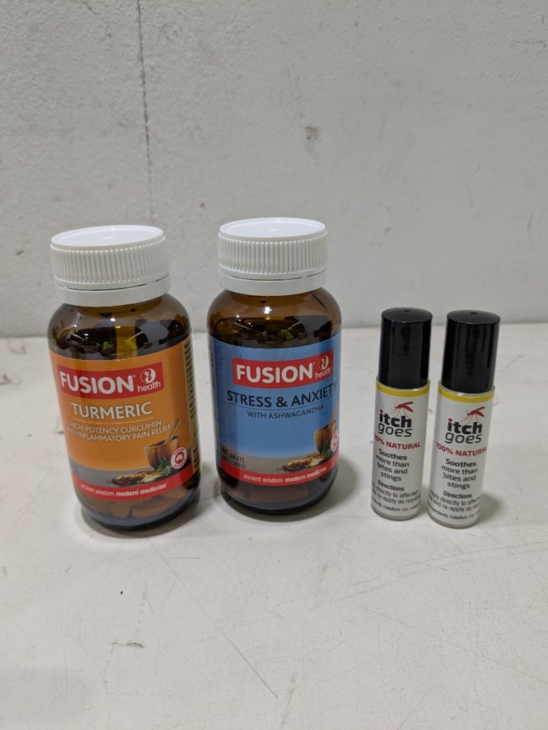 A collection of various health and wellness products, including: turmeric, stress & anxiety and more..Sold as a lot.
