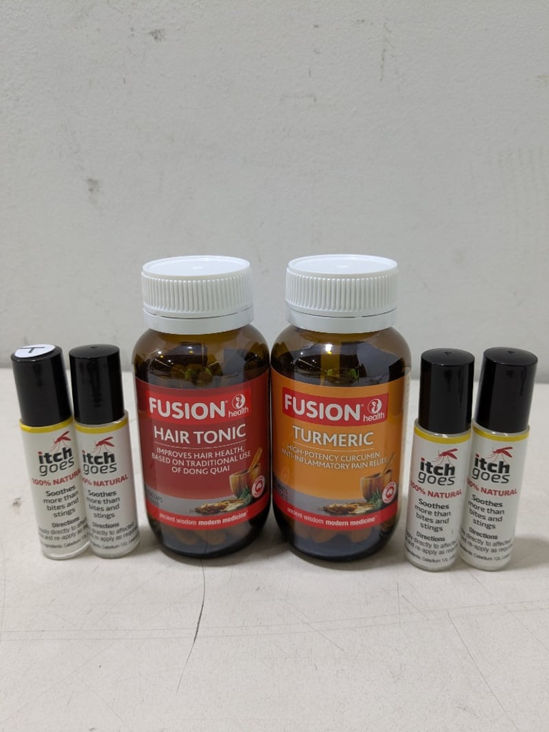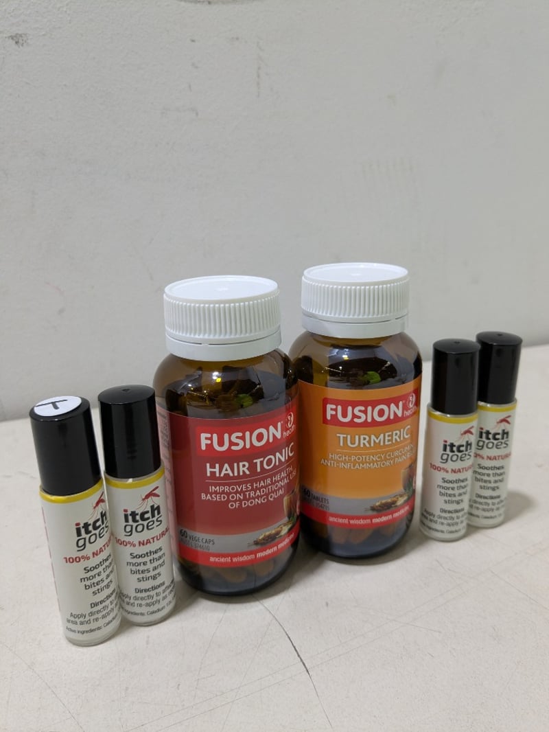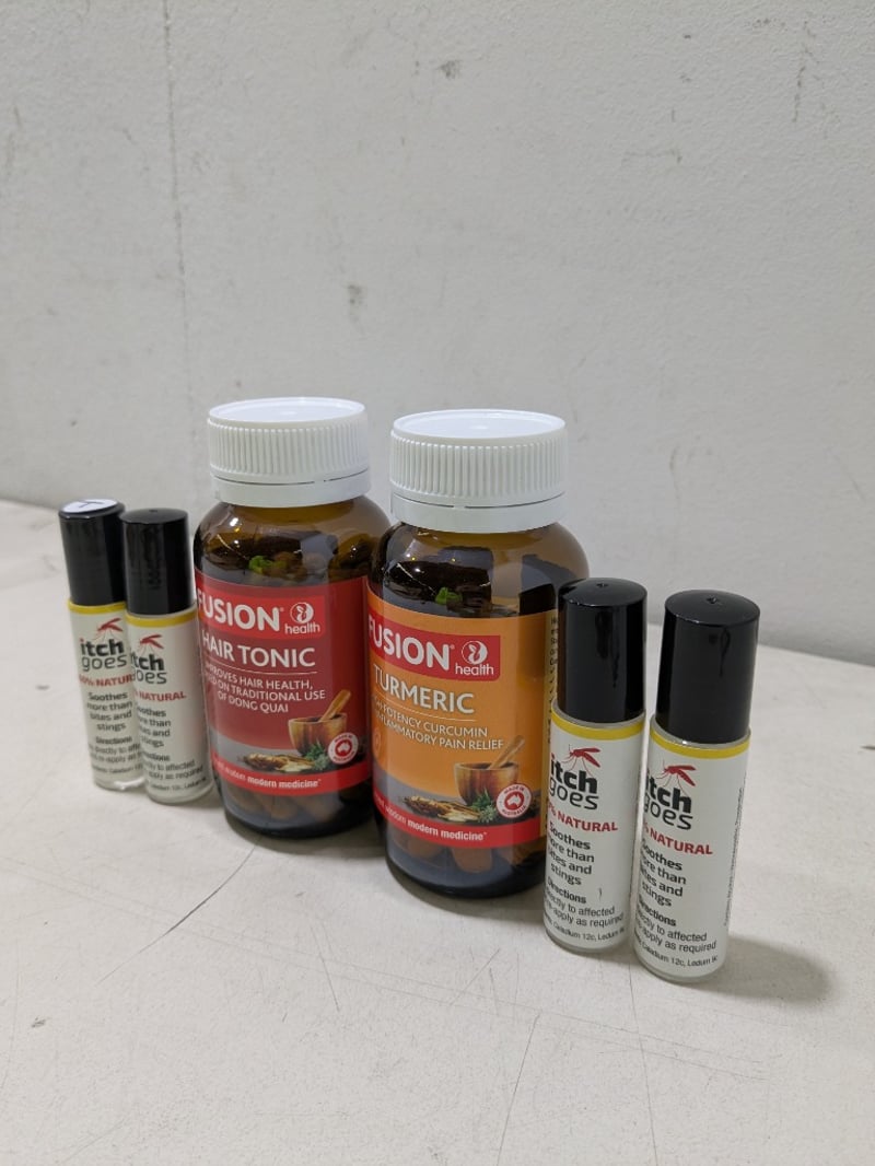 A collection of various health and wellness products, including: Turmeric, hair tonic and more. Sold as a lot.