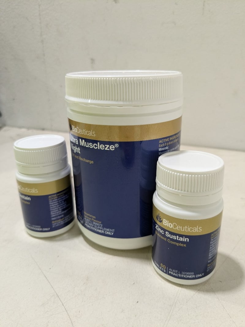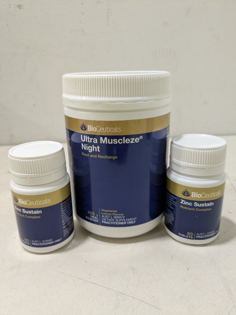 A collection of various health and wellness products, including: Ultra muscleze night and zinc sustain.Sold as a lot.