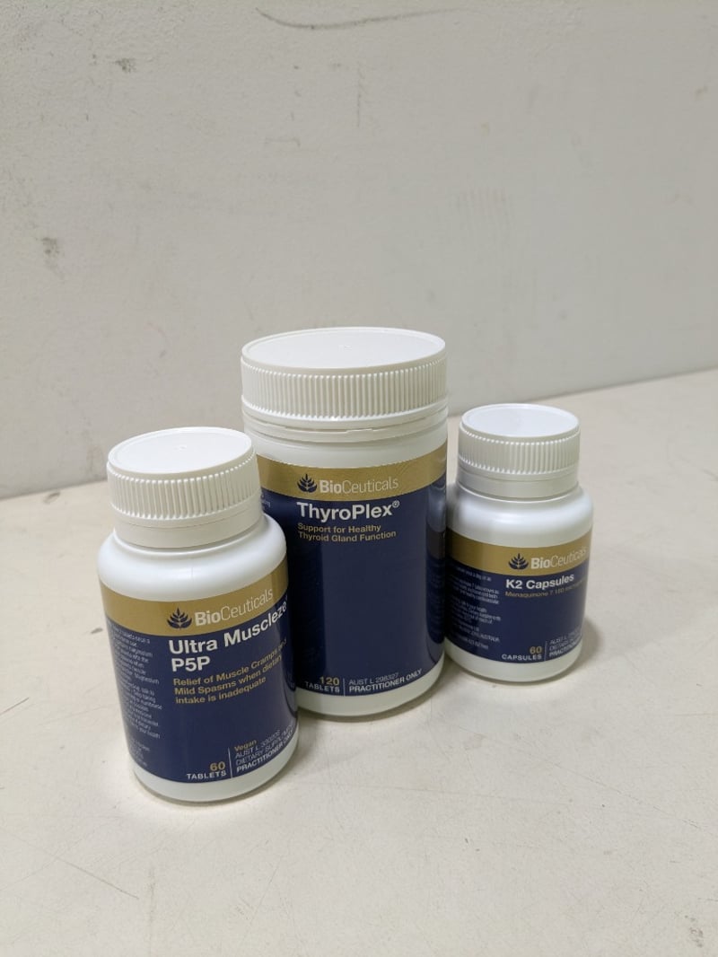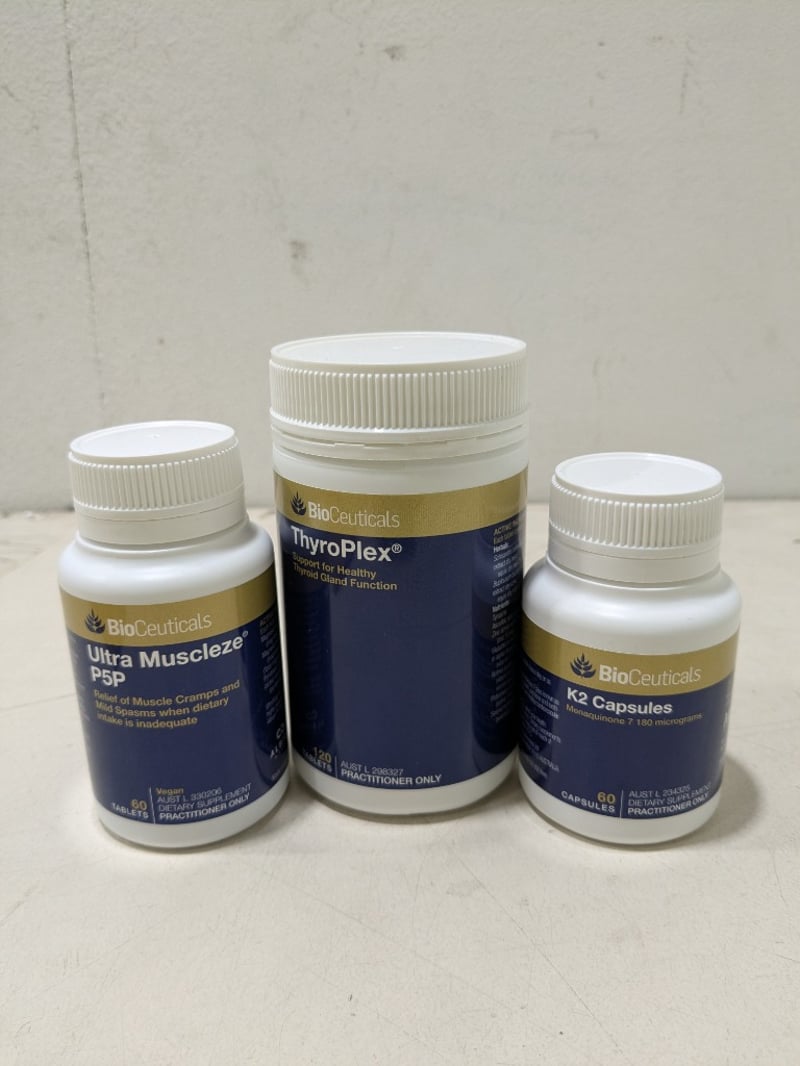 A collection of various health and wellness products, including: ThyroPlex, K2 Capsules and more. Sold as a lot.
