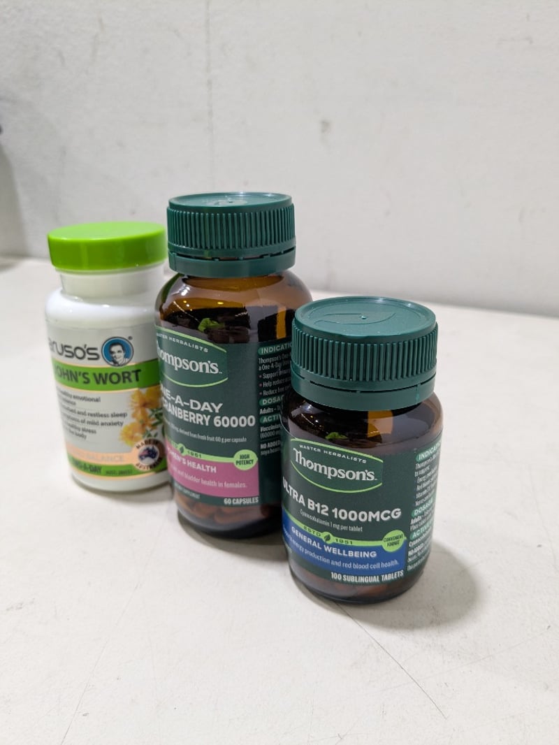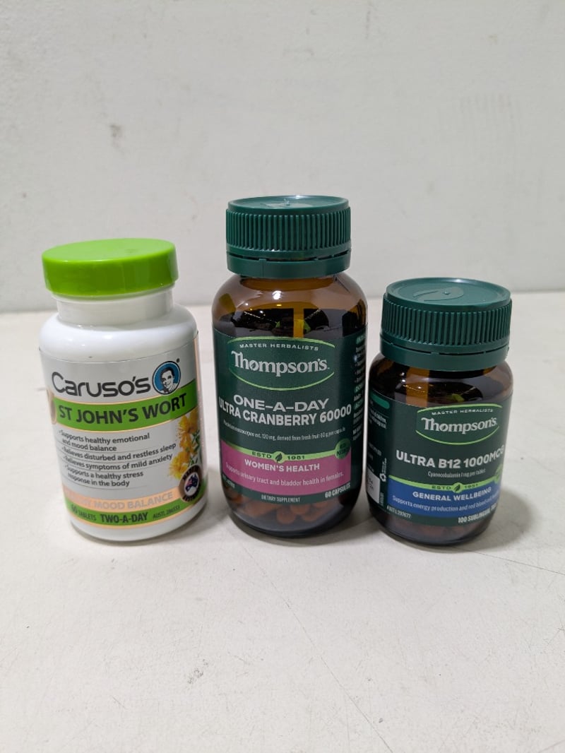 A collection of various health and wellness products, including: Ultra cranberry 60000, St John's wort and more. Sold as a lot.