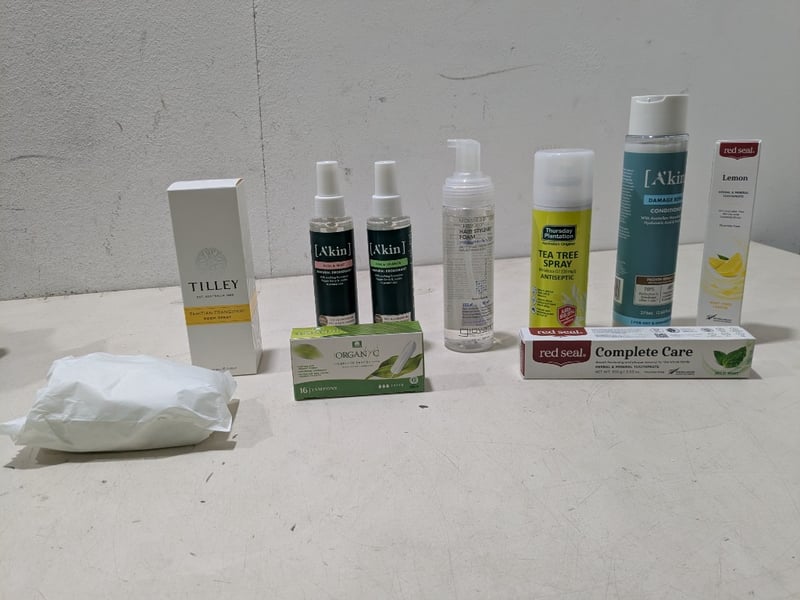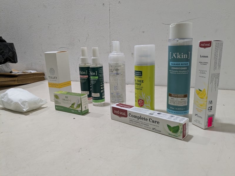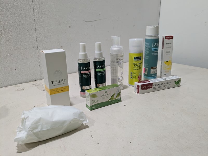 Assorted health and wellness products, including: natural deodorant, tea tree spray and more.Sold as a lot.