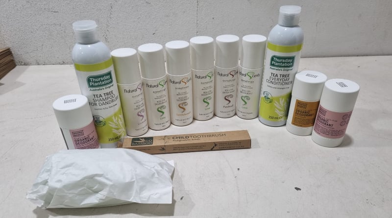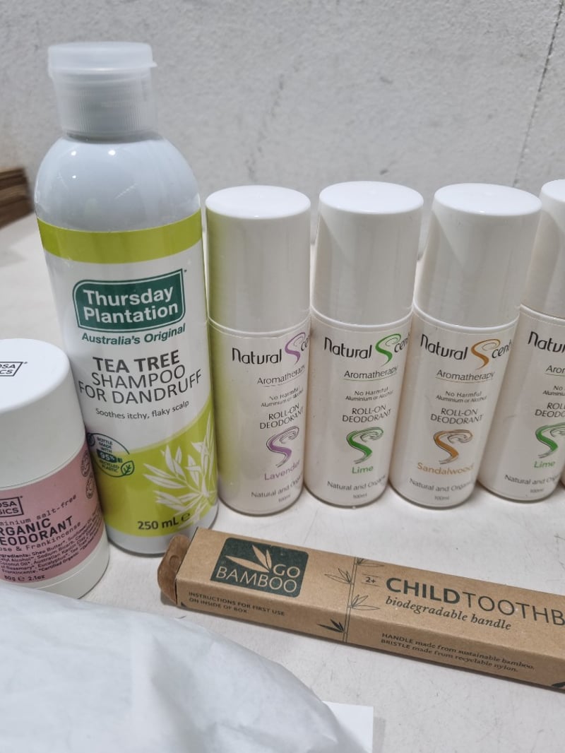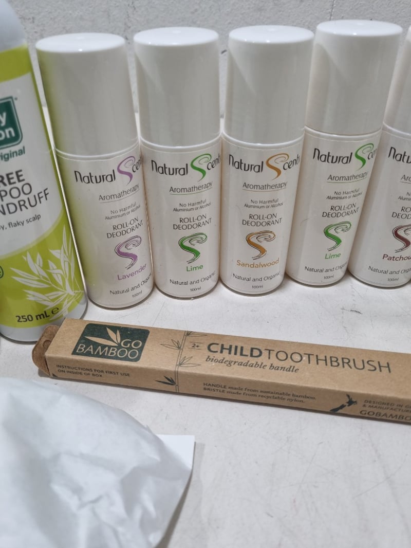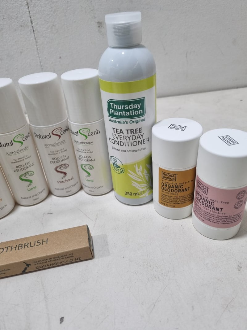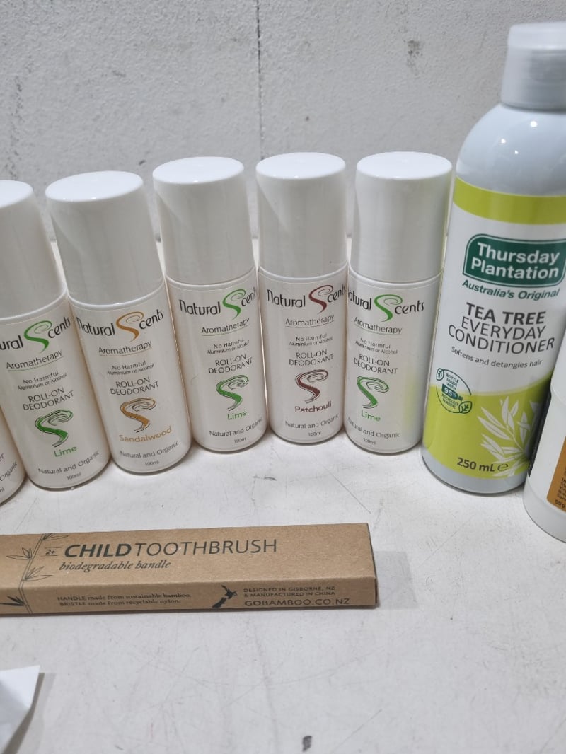 Assorted health and wellnes products, includes organic roll-on deodorant,tea tree conditioner and more.... Sold as lot