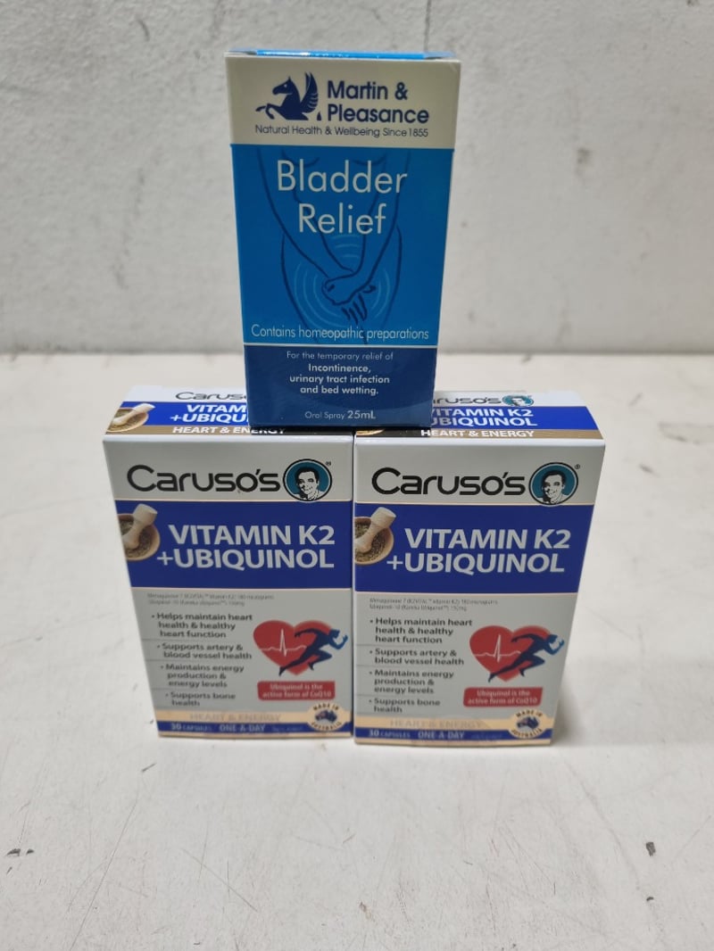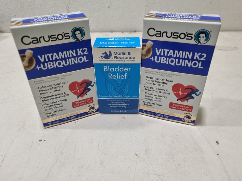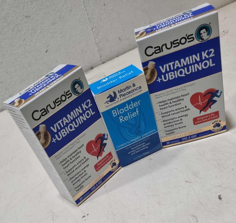 Assorted health and wellness products, includes Carusos Vitamon K2+Ubiquinol and Homeopathoc Bladder relief ....... Sold as lot