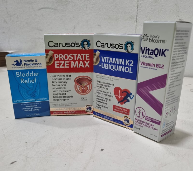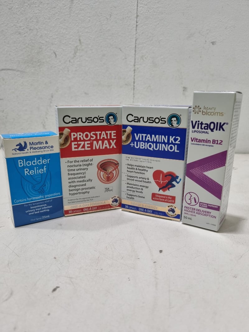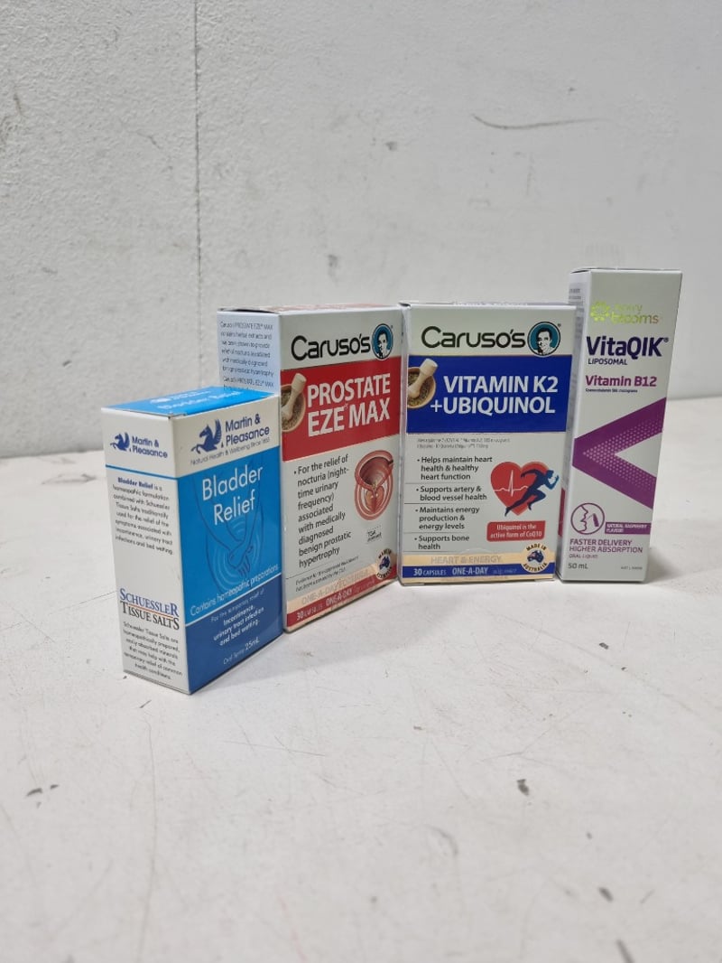 Assorted health and wellnes lot, includes Carusos Prostate Eze Max, Carusos Vitamin K2+ Ubiquinol and more........ Sold as lot