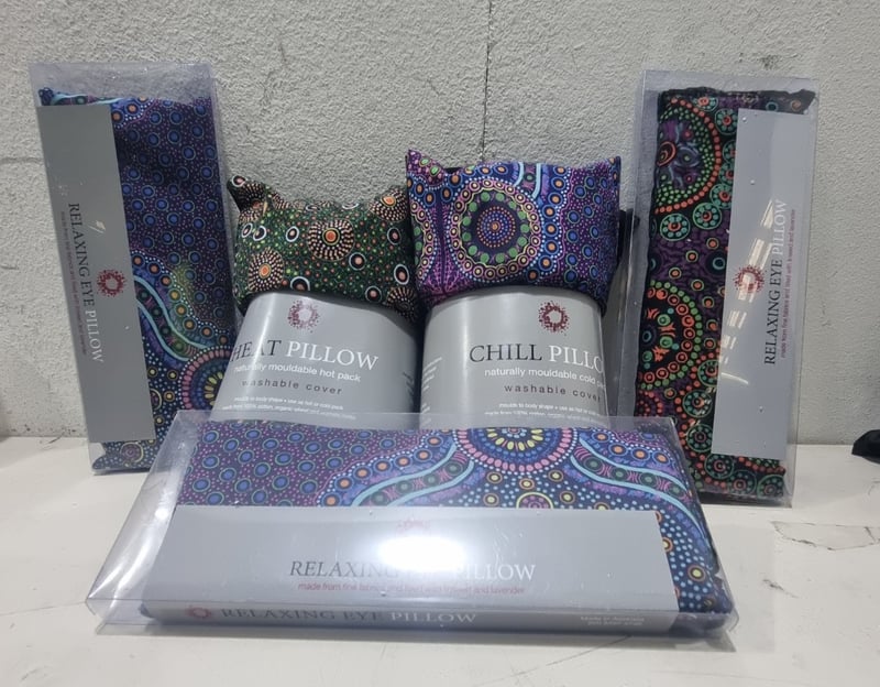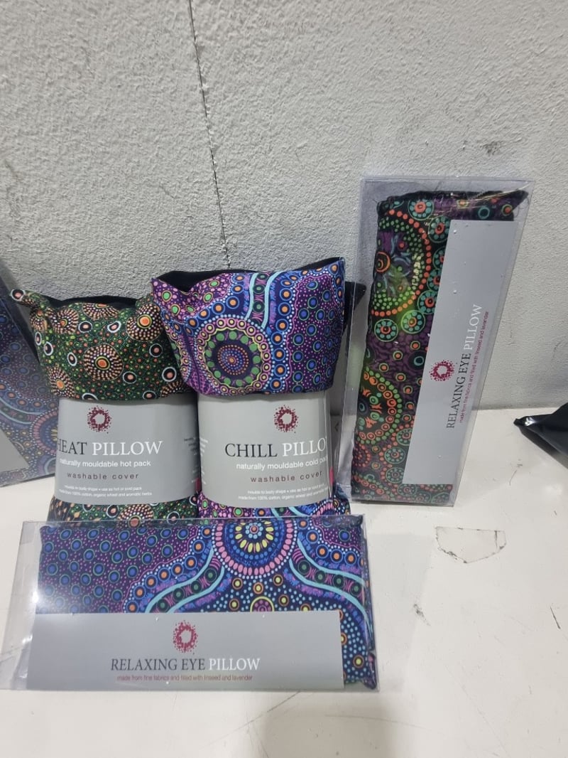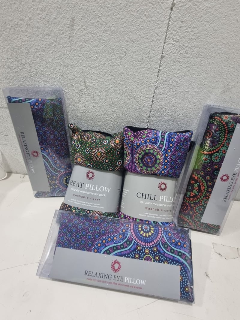 Assorted wellnes and health pillow lot, includes relaxing eye pillows,heat pillow and chill pillow. Sold as lot