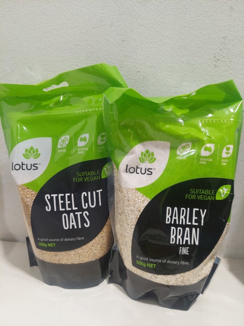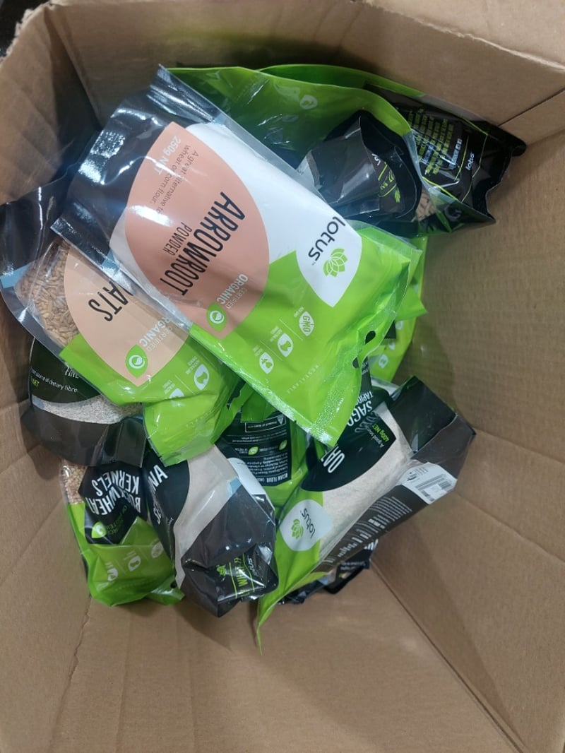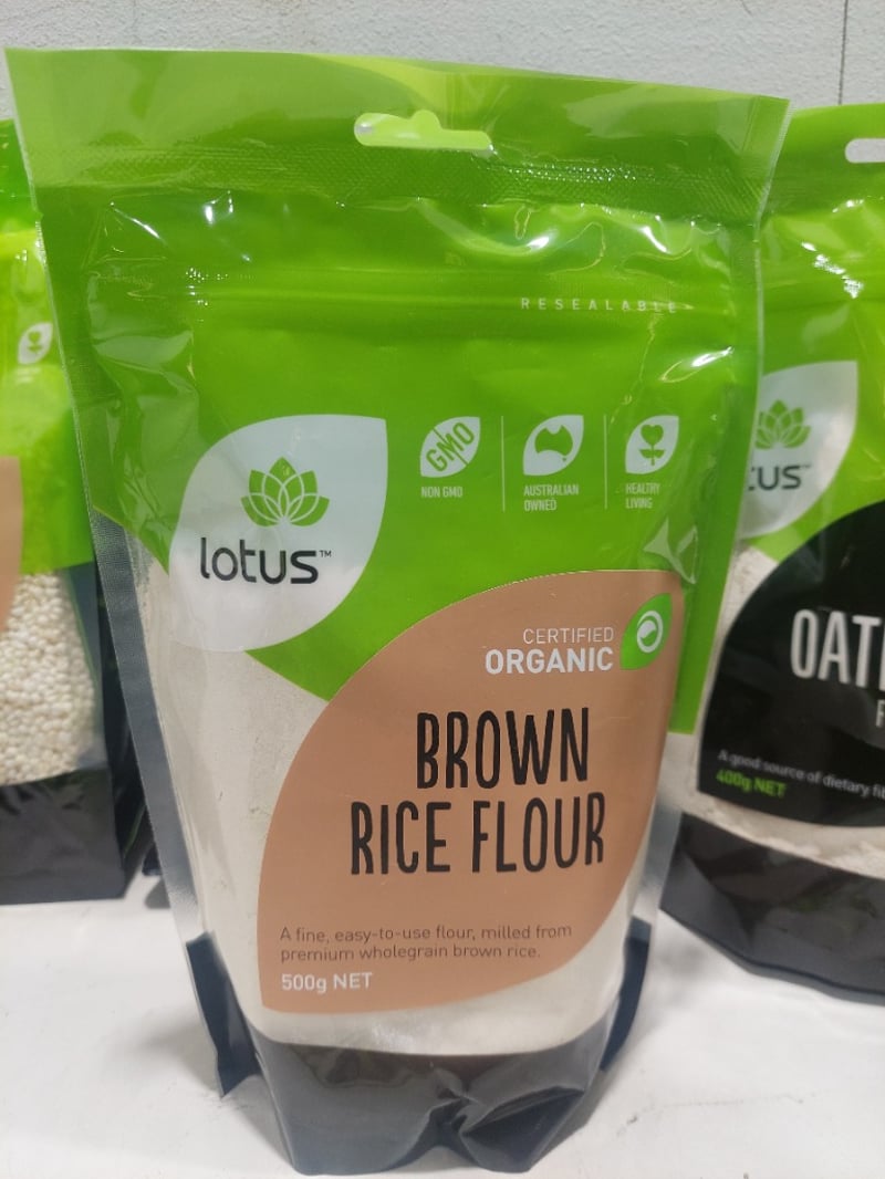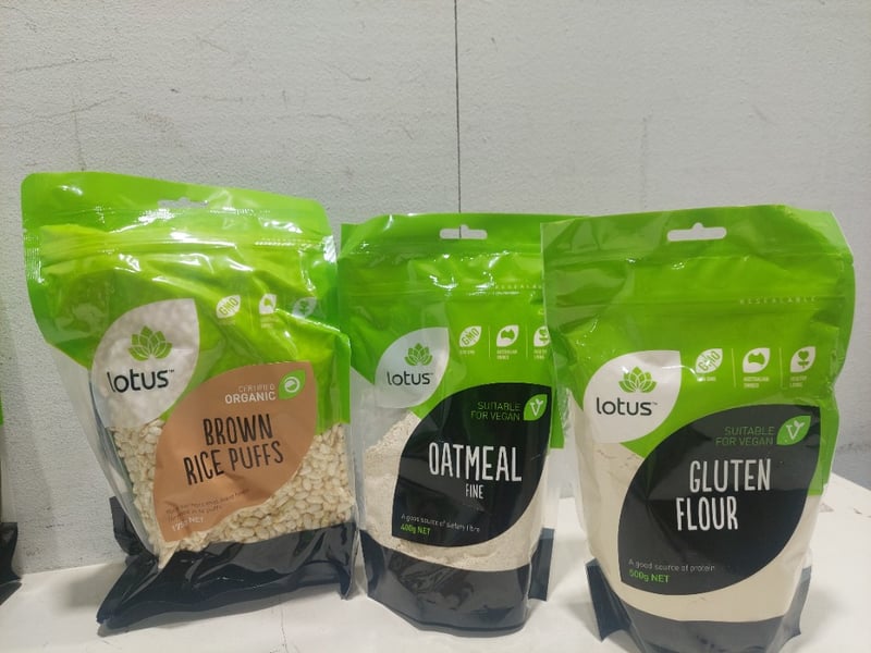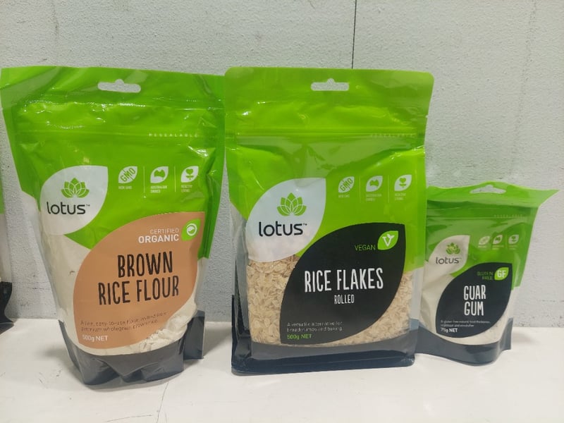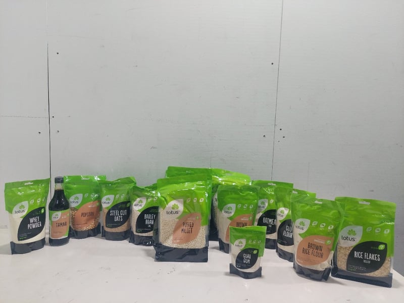 Assorted Lotus products, including brown rice powder, rice flakes arrowroot powder and more.Sold as a lot.